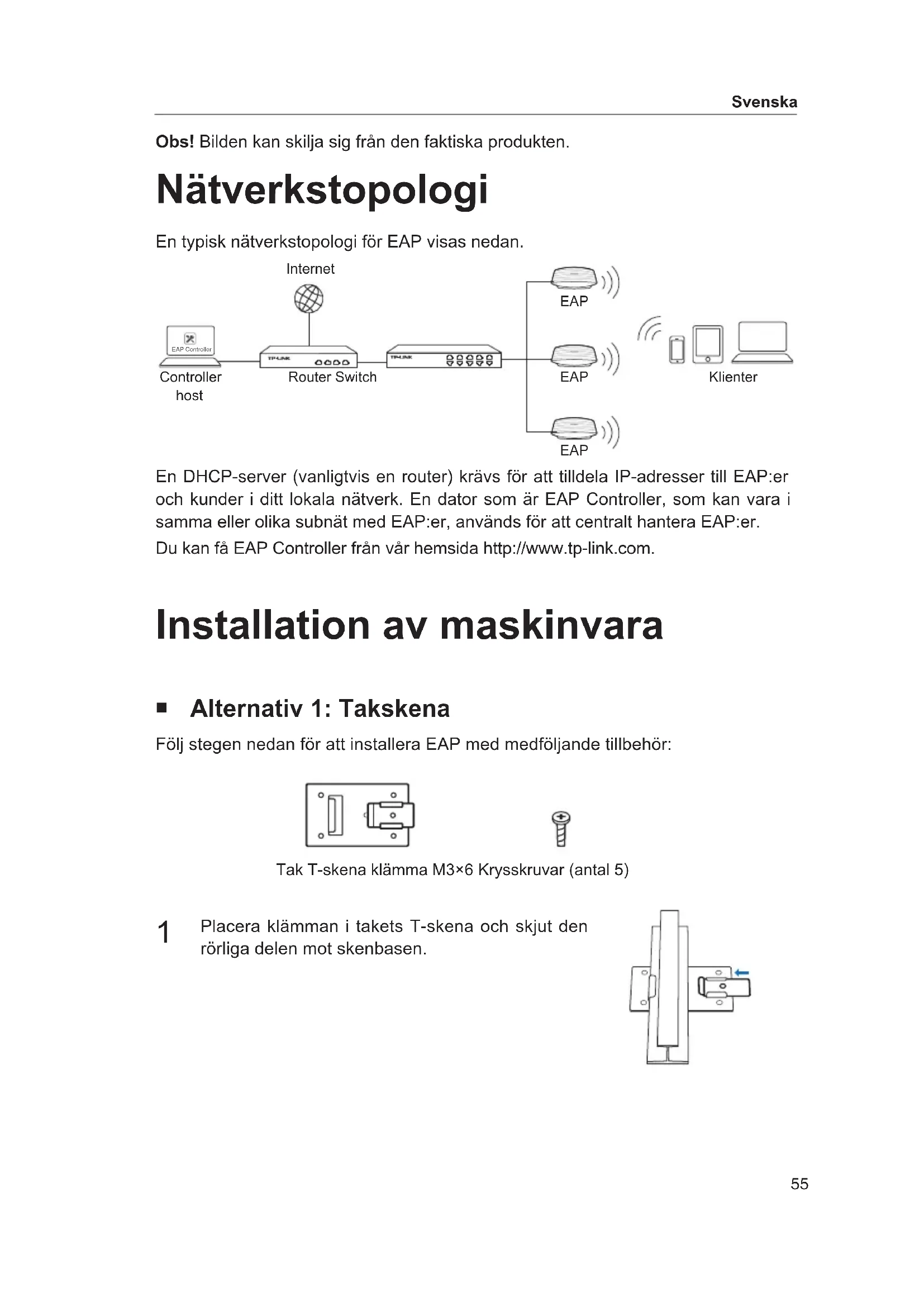 Placera klämman i takets T-skena och skjut den rörliga delen mot skenbasen. Controller host Router SwitchKlienter Tak T-skena klämma M3×6 Krysskruvar (antal 5) Internet EAP EAP EAP56 Svenska