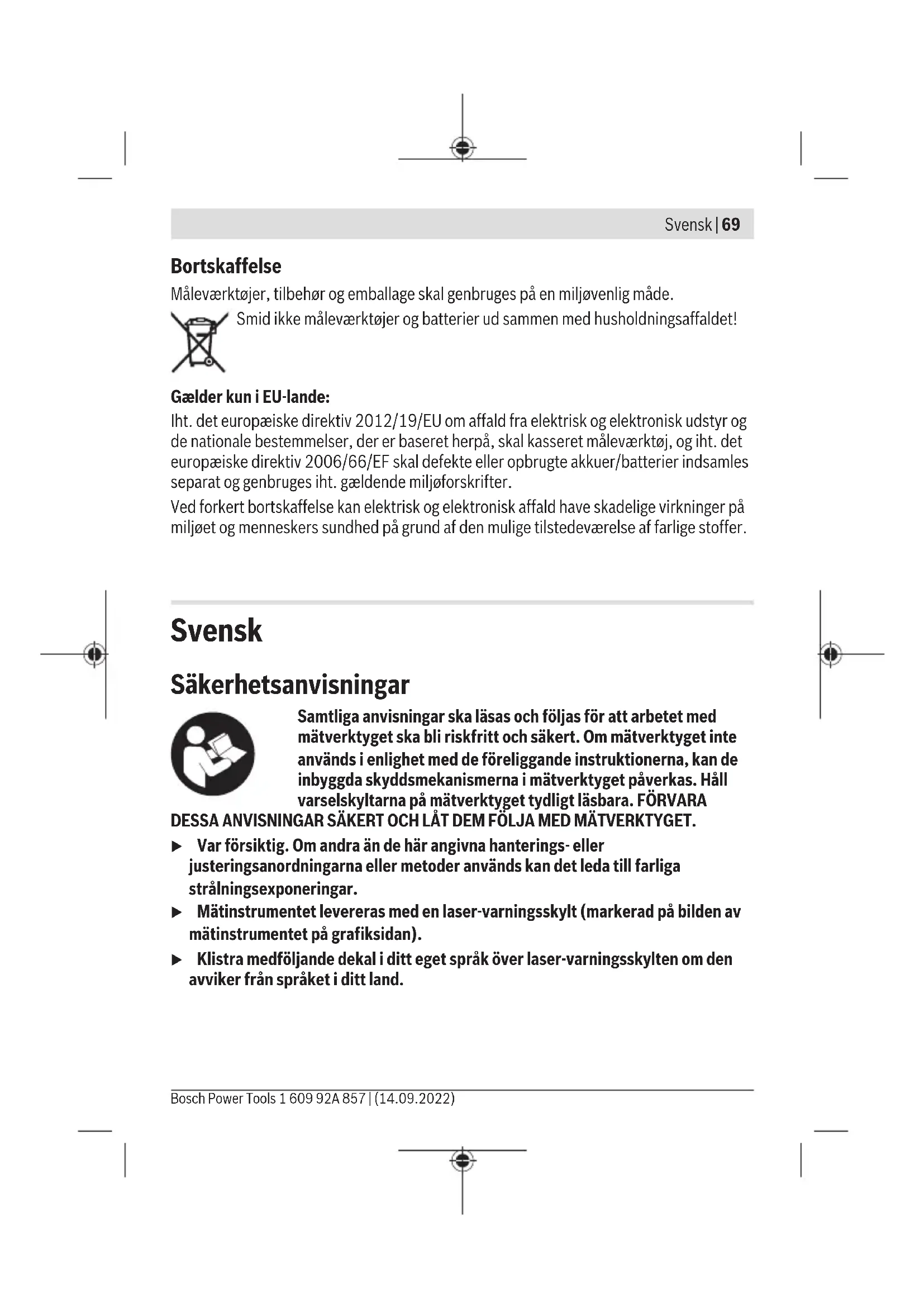 Vid 20–25°C C) Angivna värden förutsätter normala till gynnsamma omgivningsvillkor (t.ex. inga vibrationer, ingen dimma, ingen rök, inget direkt solljus). Vid kraftig temperaturvariation kan precisionsavvikelser förekomma. D) Endast en icke ledande smuts förekommer, men som på grund av kondens kan bli tillfälligt ledande. För entydig identifiering av ditt mätinstrument finns serienumret (6) på typskylten. Montering Sätta in/byta batterier Alkaliska mangan-batterier rekommenderas för mätinstrumentet. För att öppna batterifackets lock(9), tryck på arreteringen(8) och ta av locket. Sätt i batterierna. Se till att polerna hamnar rätt enligt bilden på insidan av batterifacket. Om batterierna börjar ta slut lyser batterivarningslampan(4) rött. Byt alltid ut alla batterier samtidigt. Använd bara batterier med samma kapacitet och från samma tillverkare. u Ta ut batterierna från mätinstrumentet om du inte ska använda det under en längre period. Batterierna kan vid långtidslagring i mätverktyget korrodera och självurladdas. 1 609 92A 857 | (14.09.2022) Bosch Power ToolsSvensk | 73 Drift Driftstart u Skydda mätinstrumentet mot fukt och direkt solljus. u Utsätt inte mätinstrumentet för extrema temperaturer eller stora temperatursvängningar. Låt det inte ligga exempelvis i bilen under en längre period. Låt mätinstrumentet bli tempererat igen efter stora temperatursvängningar innan du använder det. Vid extrema temperaturer eller temperatursvängningar kan mätinstrumentets precision påverkas. u Undvik kraftiga stötar eller fall hos mätinstrumentet. Genom skador på mätverktyget kan precisionen påverkas. Efter en kraftig stöt jämför du laserlinjen med en känd vågrät eller lodrät referenslinje. u Stäng av mätinstrumentet när du transporterar det. Vid avstängning låser pendelenheten, som annars kan skadas vid kraftiga rörelser. In- och urkoppling För inkoppling av mätinstrumentet, skjut strömbrytaren (2) till position On. Efter inkopplingen börjar mätinstrumentet genast sända laserstrålar genom utgångsöppningarna (1). u Rikta aldrig laserstrålen mot personer eller djur och rikta inte heller själv blicken mot laserstrålen även om du står på längre avstånd. För urkoppling av mätinstrumentet, skjut strömbrytaren (2) till position Off. Vid avstängning låses pendelenheten. u Lämna inte det påslagna mätverktyget utan uppsikt och stäng av mätverktyget efter användningen. Andra personer kan bländas av laserstrålen. Driftstyper Mätverktyget har tre driftstyper mellan vilka du kan växla när som helst: Driftstyp Krysslinjedrift med nivelleringsautomatik (se bildA): mätinstrumentet genererar en vågrät och en lodrät laserlinje. Krysslinje- och lodpunktsdrift med nivelleringsautomatik (se bildB): mätinstrumentet genererar en vågrät och två lodräta laserlinjer samt en lodpunkt nedåt. De två lodräta laserlinjerna löper i rät vinkel mot varandra. Krysslinjedrift med lutningsfunktion (se bildC): mätinstrumentet genererar en vågrät och en lodrät laserlinje. Bosch Power Tools 1 609 92A 857 | (14.09.2022)74 | Svensk Efter påslagning befinner sig mätverktyget i krysslaserdrift med nivelleringsautomatik. För att ändra driftsätt, tryck på knappen laserdriftsätt(3) tills önskat driftsätt visas genom att dess indikering (5) visas. Nivelleringsautomatik Arbete med nivelleringsautomatik Ställ mätinstrumentet på ett vågrätt, fast underlag eller sätt det på stativet(11). Välj ett av driftsätten med automatisk nivellering. Inom självnivelleringsområdet kompenserar nivelleringsautomatiken ojämnheter på ±4°. Nivelleringen är avslutad så snart laserlinjerna inte längre rör sig. Om automatisk nivellering inte är möjlig, t.ex. eftersom mätinstrumentets anliggningsyta avviker med mer än 4° från vågrätt stängs lasern av. Ställ i detta fall mätinstrumentet vågrätt och vänta på självnivelleringen. Vid skakningar eller ändringar av läge under drift nivelleras mätverktyget igen automatiskt. Efter ny nivellering, kontrollera laserlinjernas position i relation till referenspunkter för att undvika fel på grund av en förskjutning av mätverktyget. Arbete med lutningsfunktion Välj driftsättet krysslinjelaser med lutningsfunktion. Vid arbete med lutningsfunktion är nivelleringsautomatiken avstängd. Du kan hålla mätinstrumentet i handen eller ställa det på ett lutande underlag. Laserstrålarna nivelleras inte längre och löper inte längre parallellt. Arbetsanvisningar u Använd alltid endast mitten av laserpunkten resp. laserlinjen för markering. Storleken på laserpunkten resp. bredden på laserlinjen ändras med avståndet. Arbeta med stativet (tillbehör) Ett stativ ger ett stabilt, höjdjusterbart mätunderlag. Sätt mätverktyget med 1/4"- stativhållaren (10) på stativets gänga (11) eller på ett vanligt kamerastativ. Skruva fast mätinstrumentet med fästskruven. Rikta in stativet grovt innan du startar mätinstrumentet. Laser-glasögon (tillbehör) Laser-glasögonen filtrerar omgivningsljuset. Därigenom verkar laserljuset ljusare för ögat. 1 609 92A 857 | (14.09.2022) Bosch Power ToolsSvensk | 75 u Använd inte laserglasögonen (tillbehör) som skyddsglasögon. Laserglasögonen används för att kunna se laserstrålen bättre. Den skyddar dock inte mot laserstrålningen. u Använd inte laserglasögonen (tillbehör) som solglasögon eller i trafiken. Laserglasögonen skyddar inte fullständigt mot UV‑strålning och reducerar förmågan att uppfatta färg. Arbetsexempel (se bild D–F) Exempel på användningsmöjligheter för mätinstrumentet finns på grafiksidorna. Underhåll och service Underhåll och rengöring Håll alltid mätinstrumentet rent. Sänk inte ner mätinstrumentet i vatten eller andra vätskor. Torka av smuts med en fuktig, mjuk trasa. Använd inga rengörings- eller lösningsmedel. Rengör särskilt ytorna vid laserns utgångsöppning regelbundet o
