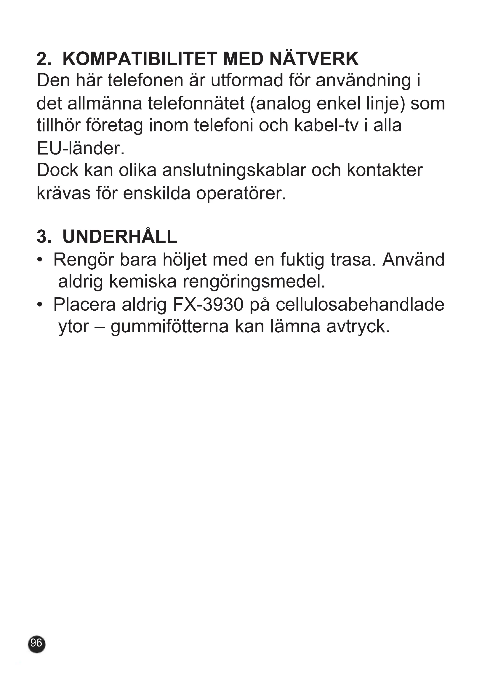 För Telefonen FYSIC FX-3930 har du en garanti på 24 manader från inköpsdatumet. Under den här tidsperiod garanterar vi kostnadsfri reparation av defekter orsakade av material- och tillverkningsfel. Ovanstäende ar beroende av den slutiga utvärderingen som utförs av importären.