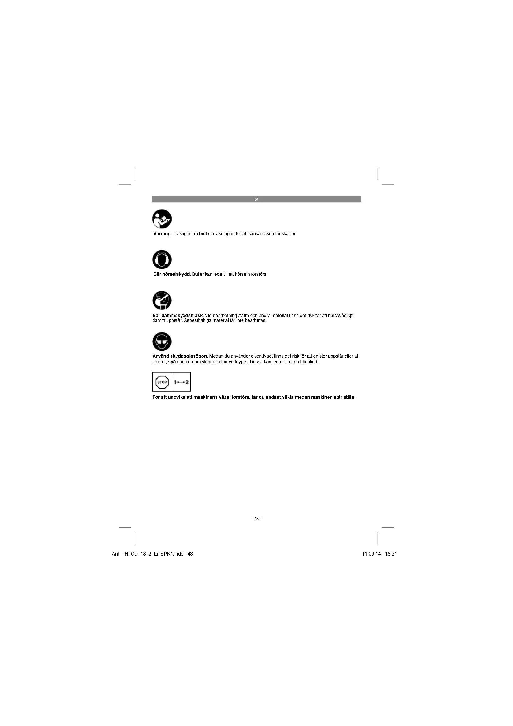 Varning - Läs igenom bruksanvisningen för att sänka risken för skador Bär hörselskydd. Buller kan leda till att hörseln förstörs. Använd skyddsglasögon. Medan du använder elverktyget fi nns det risk för att gnistor uppstår eller att splitter, spån och damm slungas ut ur verktyget. Dessa kan leda till att du blir blind. Bär dammskyddsmask. Vid bearbetning av trä och andra material fi nns det risk för att hälsovådligt damm uppstår. Asbesthaltiga material får inte bearbetas! För att undvika att maskinens växel förstörs, får du endast växla medan maskinen står stilla. Anl_TH_CD_18_2_Li_SPK1.indb 48Anl_TH_CD_18_2_Li_SPK1.indb 48 11.03.14 16:3111.03.14 16:31S