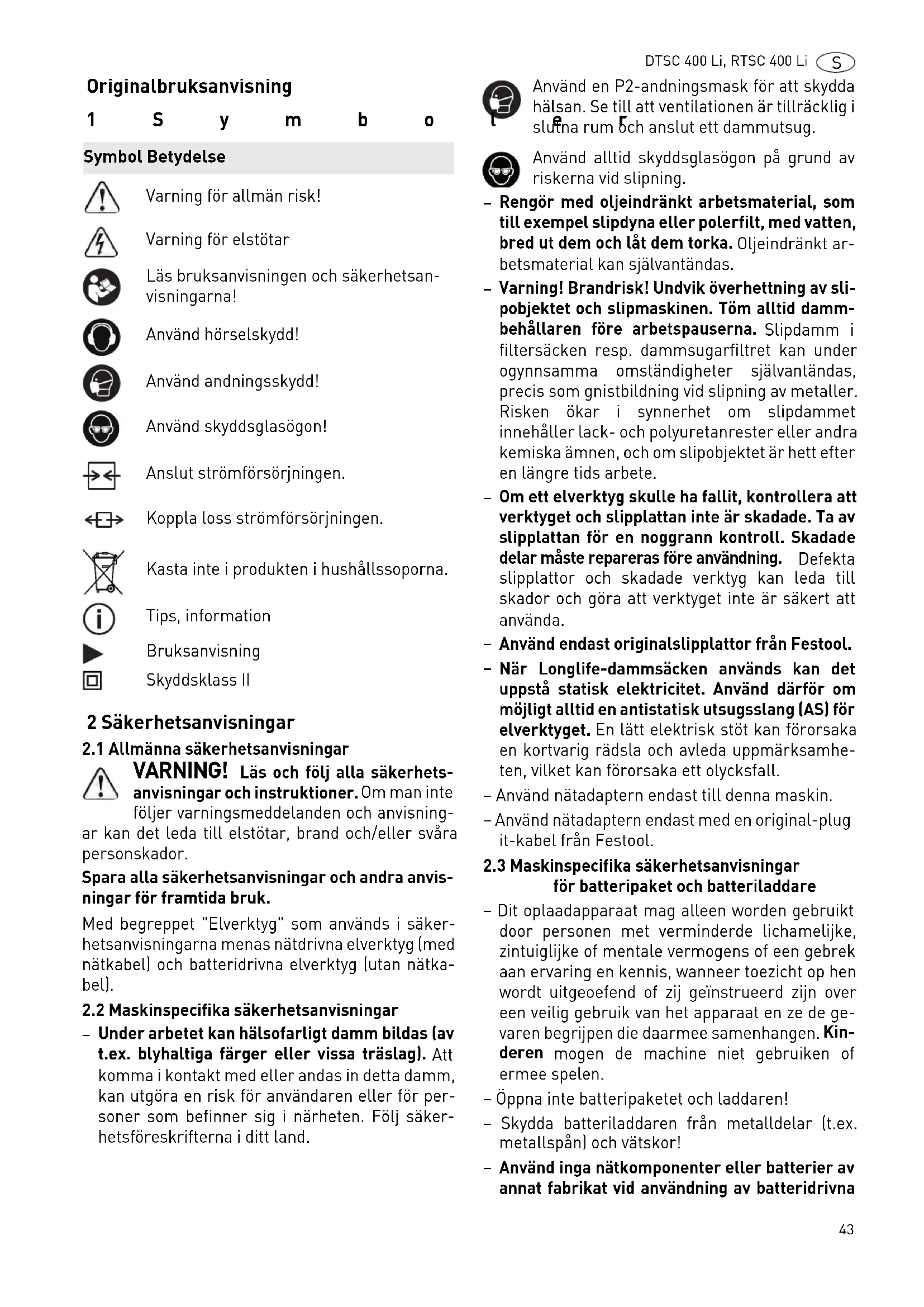 Använd inga nätkomponenter eller batterier av annat fabrikat vid användning av batteridrivna Symbol Betydelse Varning för allmän risk! Varning för elstötar Läs bruksanvisningen och säkerhetsan- visningarna! Använd hörselskydd! Använd andningsskydd! Använd skyddsglasögon! Anslut strömförsörjningen. Koppla loss strömförsörjningen. Kasta inte i produkten i hushållssoporna. Tips, information Bruksanvisning Skyddsklass II44 DTSC 400 Li, RTSC 400 Li
