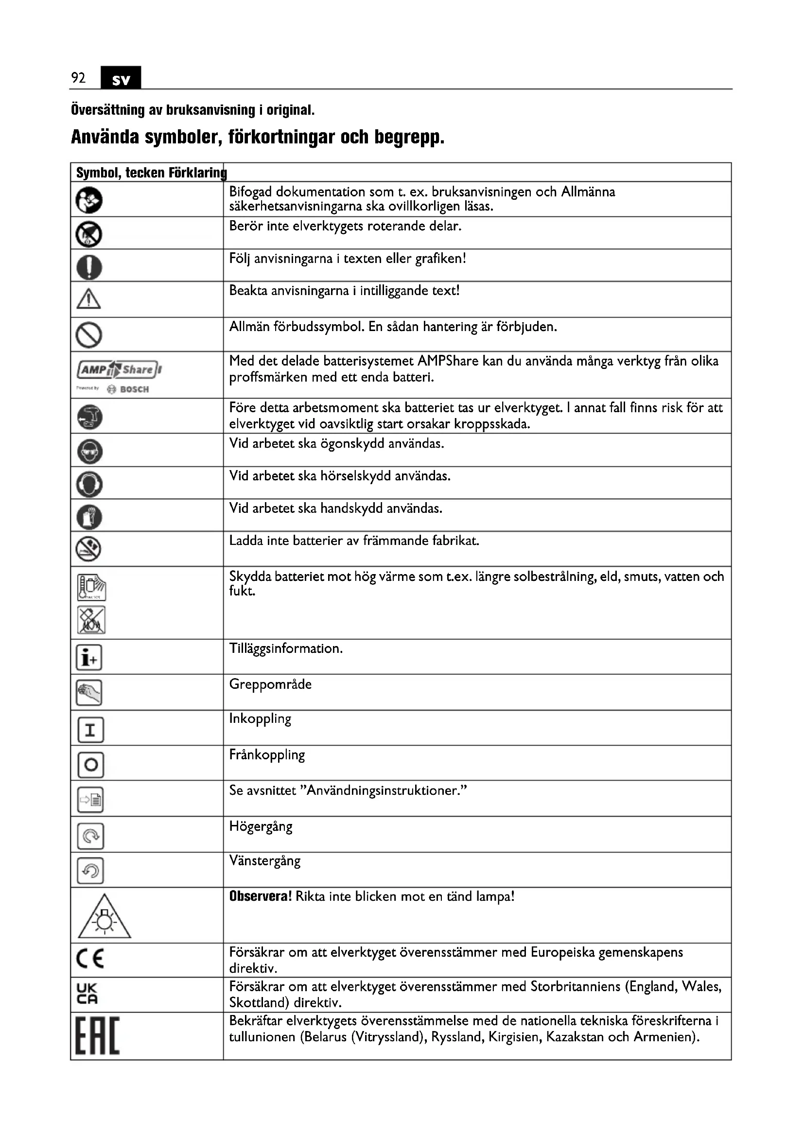 | Bifogad dokumentation som t. ex. bruksanvisingen och Allmänner sakerhetsanvisingarna ska ovillkorligen läsas. | |