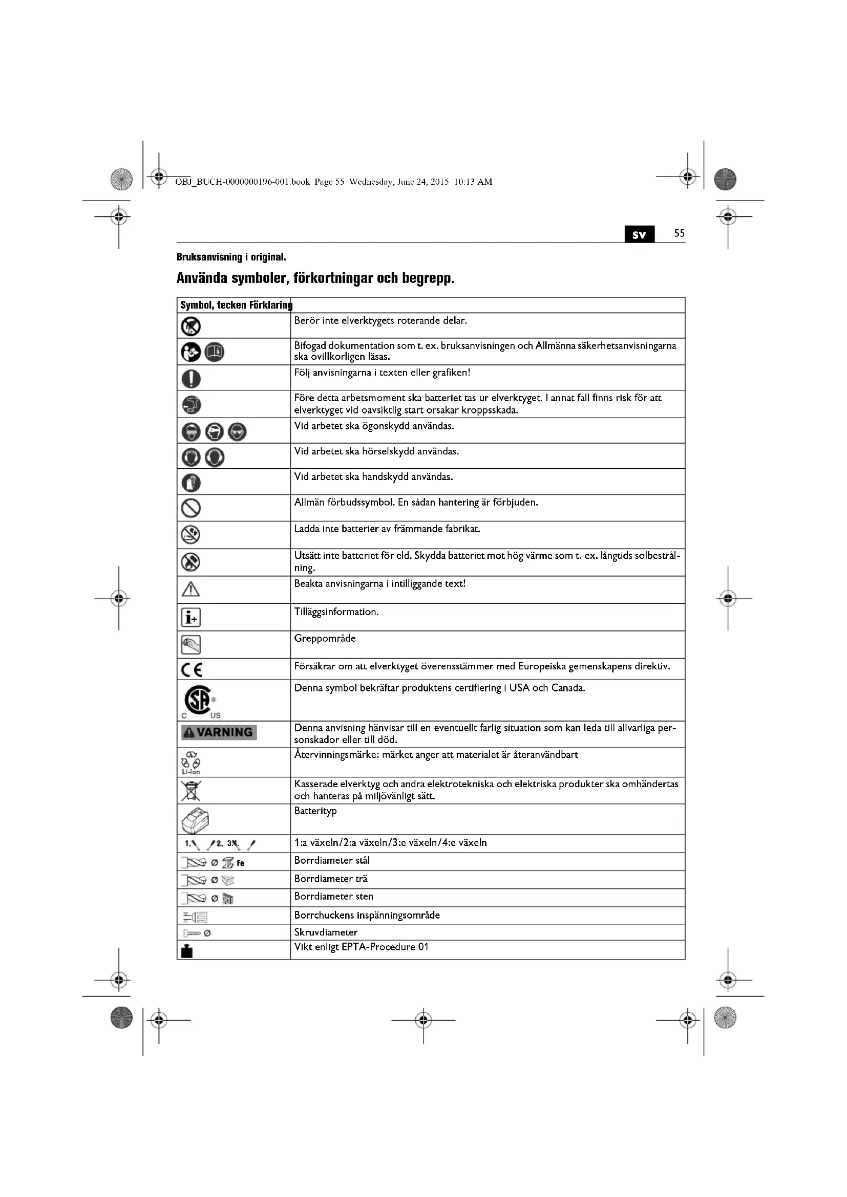 Bruksanvisning i original. Använda symboler, förkortningar och begrepp. Symbol, tecken Förklaring Berör inte elverktygets roterande delar. Bifogad dokumentation som t. ex. bruksanvisningen och Allmänna säkerhetsanvisningarna ska ovillkorligen läsas. Följ anvisningarna i texten eller grafiken! Före detta arbetsmoment ska batteriet tas ur elverktyget. I annat fall finns risk för att elverktyget vid oavsiktlig start orsakar kroppsskada. Vid arbetet ska ögonskydd användas. Vid arbetet ska hörselskydd användas. Vid arbetet ska handskydd användas. Allmän förbudssymbol. En sådan hantering är förbjuden. Ladda inte batterier av främmande fabrikat. Utsätt inte batteriet för eld. Skydda batteriet mot hög värme som t. ex. långtids solbestrål- ning. Beakta anvisningarna i intilliggande text! Tilläggsinformation. Greppområde Försäkrar om att elverktyget överensstämmer med Europeiska gemenskapens direktiv. Denna symbol bekräftar produktens certifiering i USA och Canada. Denna anvisning hänvisar till en eventuellt farlig situation som kan leda till allvarliga per- sonskador eller till död. Återvinningsmärke: märket anger att materialet är återanvändbart Kasserade elverktyg och andra elektrotekniska och elektriska produkter ska omhändertas och hanteras på miljövänligt sätt. Batterityp 1:a växeln/2:a växeln/3:e växeln/4:e växeln Borrdiameter stål Borrdiameter trä Borrdiameter sten Borrchuckens inspänningsområde Skruvdiameter Vikt enligt EPTA-Procedure 01