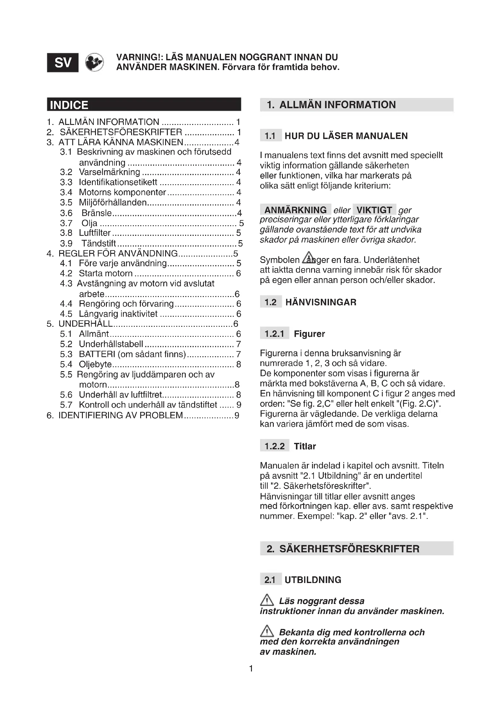 Läs noggrant dessa instruktioner innan du använder maskinen. Bekanta dig med kontrollerna och med den korrekta användningen av maskinen. VARNING!: LÄS MANUALEN NOGGRANT INNAN DU ANVÄNDER MASKINEN. Förvara för framtida behov.