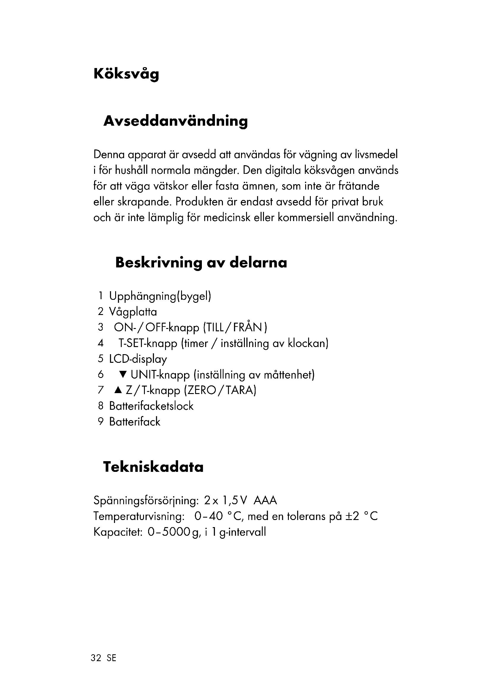 OCH BARN! Lämna aldrig barn med förpackningsmaterialet utan uppsikt. Kvävningsrisk föreligger vid hantering av förpackningsmaterial. Barn underskat- tar gärna riskerna. Håll alltid förpack- ningsmaterialet utom räckhåll för barn.34 SE LIVSFARA! Batterier är lätta att svälja, vilket kan vara livsfar- ligt. Kontakta omedelbart läkare om någon har svalt ett batteri. Denna apparat kan användas av barn från och med 8 år samt av personer med nedsatt fysisk, motorisk eller mental förmåga eller med bristande erfarenhet och kunskap, om de hålls under uppsikt eller instruerats om en säker användning av apparaten och om de förstått de ris- ker som användningen kan medföra. Barn får inte leka med apparaten. Ren- göring och underhåll får inte utföras av barn utan uppsikt av vuxen person. 5 kg SE UPP! Belasta inte vågen över 5 kg. Detta kan skada pro- dukten. Skydda produkten mot elektrostatisk uppladdning / urladdning. Detta kan störa den interna dataöverföringen, vilket skapar fel på LCD-displayen. Kontrollera att produkten inte är skadad innan du börjar använda den. Använd aldrig produkten om den är skadad.35 SE Försök aldrig att öppna produktens kåpa. Detta kan förorsaka personskador och materiella skador. Låt endast behörig elektriker utföra repara- tioner. Säkerställ att alla som använder produk- ten har läst bruksanvisningen och kan använda produkten på ett säkert sätt. Ställ produkten på ett hårt, vågrätt och plant underlag. Produktens funktioner kan störas av mag- netiska störningsfält. Ta i detta fall kort ut batterierna ur produkten och sätt i dem på nytt igen. LÄMPLIG FÖR LIVSMEDEL! Smak- och luktegenskaper påverkas ej av denna produkt. Säkerhetsinformation om batterier Ta ut batterierna ur apparaten, om de inte använts under en längre tid. SE UPP! EXPLOSIONSRISK! Ladda aldrig batterierna!36 SE Kontrollera rätt polaritet när du sätter i batterierna! Denna visas i batterifacket. Rengör vid behov batteriernas och apparatens kontakter innan du sätter i batterierna. Ta alltid bort förbrukade batterier ur apparaten omedelbart. Risken finns att batterisyra läcker ut! Kasta inte batterier i hushållssoporna! Alla konsumenter är skyldiga enligt lag att se till att batteriernas avfallshantering utförs på rätt sätt! Håll batterier utom räckhåll för barn, kasta inte batterier i öppen eld, kortslut ej batterier och öppna dem inte. Vid icke beaktande av dessa anvis- ningar kan batterierna djupurladdas. Risk för läckage föreligger. Om batte- rierna i din apparat läcker, ta ut dem omedelbart för att förhindra skador på apparaten. Undvik kontakt med hud, ögon och slemhinnor. Spola omedelbart av den kroppsdel som kommit i kontakt med37 SE batterisyran med mycket vatten och / eller uppsök läkare! Före användning Sätta i / byta batterier Hänvisning: Se till att apparaten är avstängd innan du byter batterier. Ta loss batterifackets lock