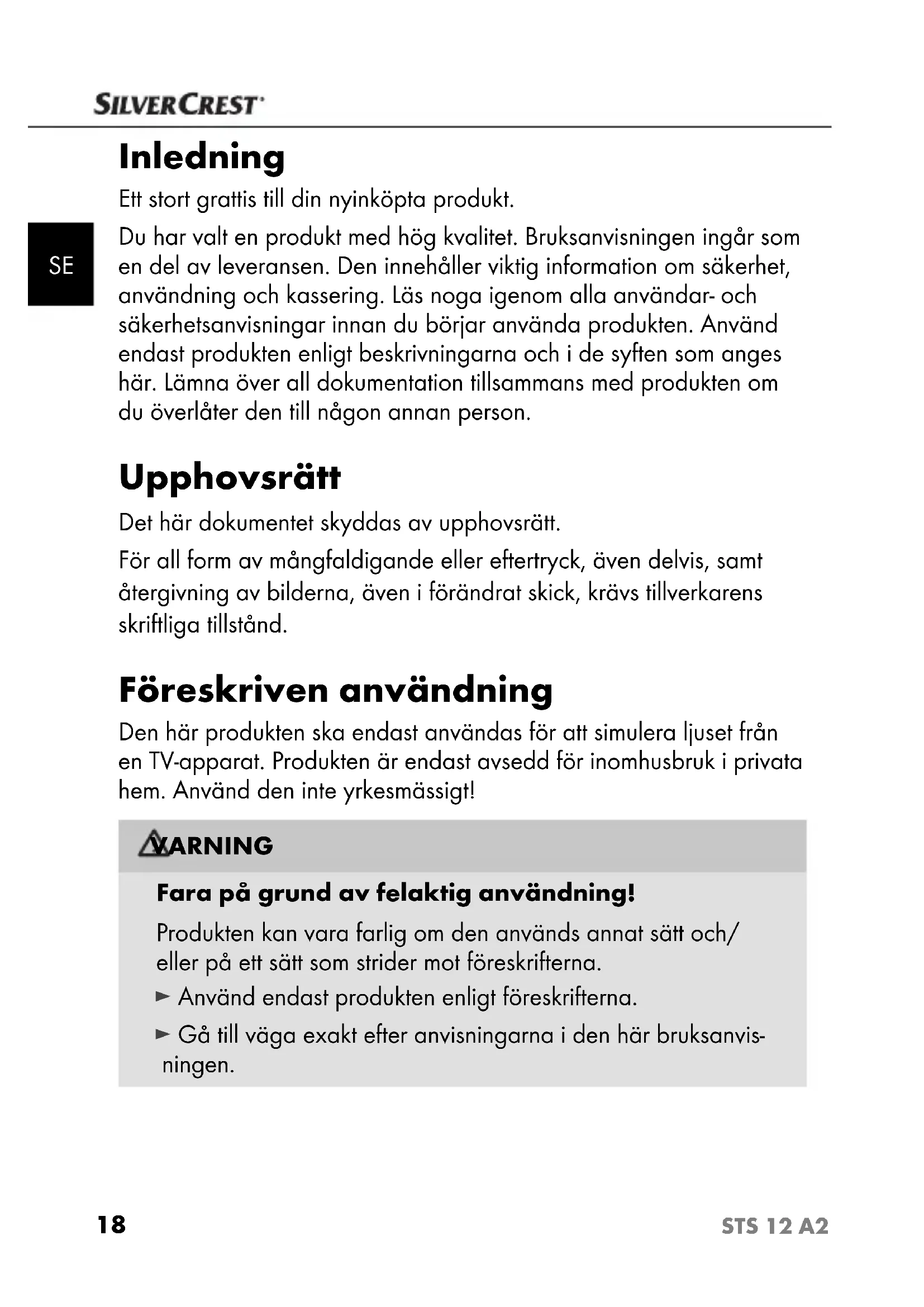 Ladda ner instruktionerna för din Ljusimulator i PDF-format gratis! Hitta din manual STS 12 A2 - SILVERCREST och ta tillbaka ditt elektroniska enhet i hand. På denna sida publiceras alla dokument som behövs för att använda din enhet. STS 12 A2 av märket SILVERCREST.