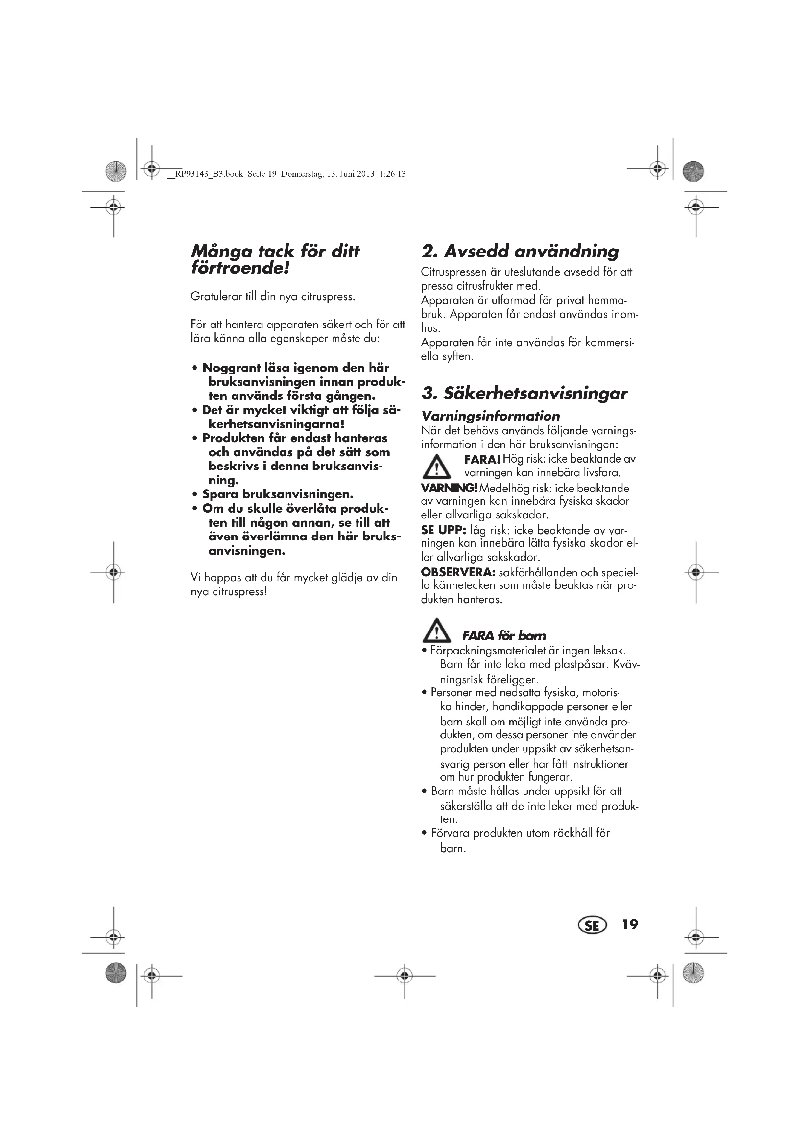 Varningsinformation När det behövs används följande varnings- information i den här bruksanvisningen: FARA! Hög risk: icke beaktande av varningen kan innebära livsfara. VARNING! Medelhög risk: icke beaktande av varningen kan innebära fysiska skador eller allvarliga sakskador. SE UPP: låg risk: icke beaktande av var- ningen kan innebära lätta fysiska skador el- ler allvarliga sakskador. OBSERVERA: sakförhållanden och speciel- la kännetecken som måste beaktas när pro- dukten hanteras. FARA för barn