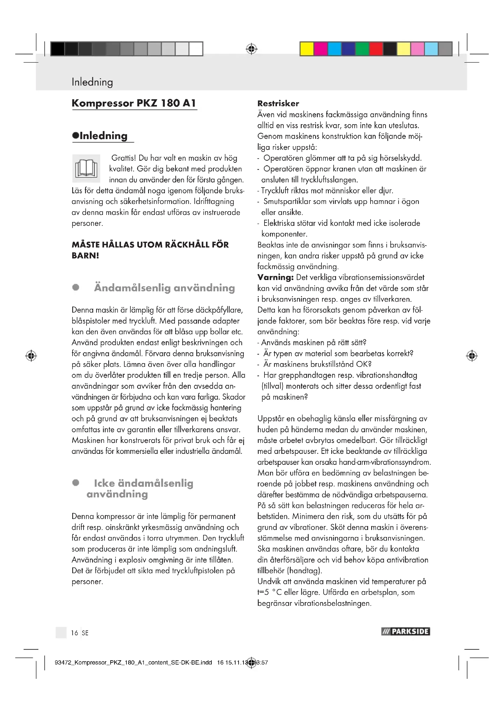 : 1,93 dB (A) Garanterad Ljudeffektnivå: 97 dB (A) Skyddstyp: IP20 Maskinens vikt: ca 6,0 kg Mätvärde har fastställts enligt: EN ISO 2151 Bullerbelastningen mäts enligt EN ISO 2151 Driftläge S3-15 %-10 min: S3 = Intermittent drift utan påverkan av startproceduren. Under en period på 10 min är max. drifttiden 15 % (1,5 min). Allmän säkerhetsinformation för tryckluftsverktyg Hänvisning: Orden ”tryckluftsverktyg” eller ”ma- skin” i följande text beträffar de tryckluftsverktyg som nämns i denna bruksanvisning. När tryckluftsverktyg kommer till användning, måste man beakta grund- läggande säkerhetsåtgärder, för att utesluta risker för brand, elektriska stötar och personskador. Det är mycket viktigt att läsa och beakta dessa hänvis- ningar i bruksanvisningen före första användningen. Förvara bruksanvisningen för framtida bruk. Tillver- karen ansvarar ej för skador eller personskador, som uppstår på grund av att denna bruksanvisning inte beaktas. Denna apparat kan användas av barn från och med 8 år samt av personer med nedsatt fysisk, motorisk eller mental förmåga eller med bristande erfarenhet och kunskap, om de hålls under uppsikt eller instruerats om en säker användning av apparaten och om de förstått de risker som användningen kan medföra. Barn får inte leka med apparaten. Rengöring och underhåll får inte utföras av barn utan uppsikt av vuxen person. RISK FÖR SKADOR! Stäng av tillförseln av tryckluft innan underhåll utförs på maskinen. Använd apparaten endast för avsedda ändamål! Överbelasta inte maskinen. Använd aldrig väte, syre, koldioxid eller andra gaser i flaskor som energikälla för denna maskin, då detta kan för- orsaka explosioner med allvarliga personskador som följd. 93472_Kompressor_PKZ_180_A1_content_SE-DK-BE.indd 17 15.11.13 13:5718 SE Allmän säkerhetsinformation ... / Allmänna säkerhetsanvisningar för elektriska ... Allmän säkerhetsinformation för tryckluftsverktyg Maskinen ska underhållas och rengöras regel- bundet enligt instruktionerna (se kapitel ”Ren- göring / skötsel”). EXPLOSIONSRISK! Använd aldrig bensin eller annan lättantändlig vätska för rengöring av tryckluftsapparaten! Ångor som finns kvar i tryckluftsapparaten kan fatta eld och förorsaka att maskinen exploderar. Använd inte maskinen i områden där explosions- risk eller brandrisk föreligger, t.ex. i närheten av brännbar vätska, gas eller damm. Bearbeta inga material som kan vara lättan- tändliga eller explosiva. Kontrollera maskinen före användning med avseende på skador. Kontrollera före varje användning om maskinen befinner sig i ett felfritt skick. Var uppmärksam hela tiden! Oväntade rörelser från maskinen kan innebära risker. Undvik onaturliga kroppsställningar. Stå stadigt och med en god balans. Därmed kan du kont- rollera tryckluftsverktyget bättre om oförutsedda situationer skulle uppstå. Använd inte maskinen med defekta strömbry- tare. En maskin som inte går att slå på eller stänga av är farlig och måste repareras. Tryckluftsverktyg som inte används ska förvaras utom räckhåll för barn. Låt inte personer använda verktyget utan att de känner till användningen eller har läst bruksan- visningen. Tryckluftsverktyg är farliga om de används av oerfarna personer. Maskinen måste skötas med omsorg. Kontrollera att alla maskinens rörliga komponenter funge- rar felfritt och inte fastnar samt att inga delar är trasiga eller skadade på ett sätt som påverkar maskinens funktion. Reparera skadade delar innan verktyget används. Många olyckor har orsakats av maskiner i dåligt skick. Stäng av maskinen när den inte längre används. Använd personlig skyddsutrustning och bär alltid skyddsglasögon. Användning av personlig skyddsut- rustning som dammskyddsmask, halkfria skydds- skor, skyddshjälm eller hörselskydd, beroende på tryckluftsverktygets typ och användning, minskar risken för skador. Kontrollera alla anslutningar och matarledningar. Alla underhållsenheter, kopplingar och slangar måste vara avsedda för de tryck och luftmäng- der som gäller för maskinen. För lågt tryck för- sämrar maskinens funktion och för högt tryck kan leda till person- och materialskador. Skydda slangarna mot att böjas eller strypas samt mot lösningsmedel och vassa kanter. Håll slangarna borta från värme, olja och rote- rande delar. Se till att slangklämmor alltid är ordentligt åt- dragna. Slangklämmor som är skadade eller inte är ordentligt åtdragna kan leda till att luft läcker okontrollerat. Skadade slangar måste bytas omgående. En skadad matarledning kan leda till att trycklufts- slangen okontrollerat slår fram och tillbaka, vilket kan förorsaka personskador. Om anslutningsledningen till maskinen skadas måste den bytas ut av tillverkaren eller dennes kundtjänst, eller av en behörig person med liknande kvalifikationer för att undvika risk för skador. Använd inte maskinen om du är trött eller på- verkad av droger, alkohol eller läkemedel. Ett ögonblick av ouppmärksamhet under använd- ningen kan leda till allvarliga personskador. Andas inte in frånluften. Undvik att få frånluften direkt i ögonen. Tryck- luftsapparatens frånluft kan innehålla vatten, olja, metallpartiklar eller föroreningar från kompres- sorn. Dessa kan vara hälsofarliga.