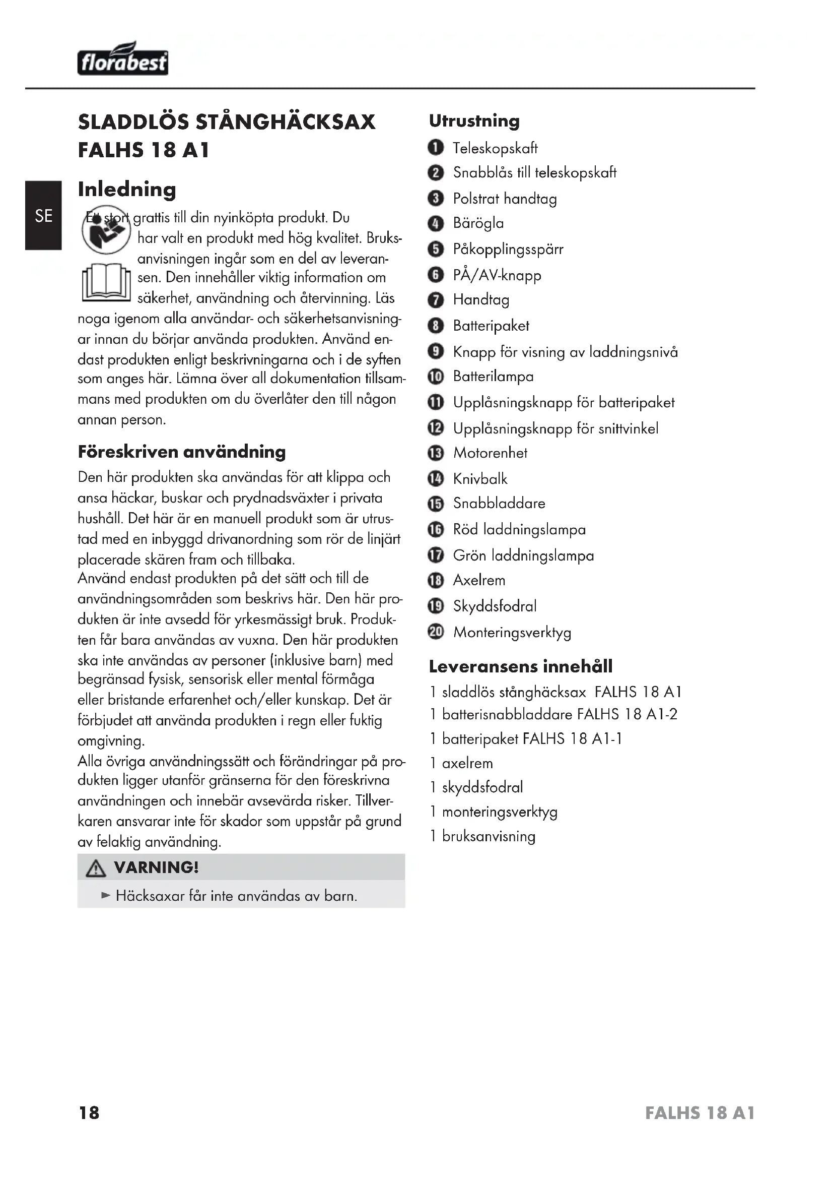 FALHS 18 A1 Inledning Ett stort grattis till din nyinköpta produkt. Du har valt en produkt med hög kvalitet. Bruks- anvisningen ingår som en del av leveran- sen. Den innehåller viktig information om säkerhet, användning och återvinning. Läs noga igenom alla användar- och säkerhetsanvisning- ar innan du börjar använda produkten. Använd en- dast produkten enligt beskrivningarna och i de syften som anges här. Lämna över all dokumentation tillsam- mans med produkten om du överlåter den till någon annan person. Föreskriven användning Den här produkten ska användas för att klippa och ansa häckar, buskar och prydnadsväxter i privata hushåll. Det här är en manuell produkt som är utrus- tad med en inbyggd drivanordning som rör de linjärt placerade skären fram och tillbaka. Använd endast produkten på det sätt och till de användningsområden som beskrivs här. Den här pro- dukten är inte avsedd för yrkesmässigt bruk. Produk- ten får bara användas av vuxna. Den här produkten ska inte användas av personer (inklusive barn) med begränsad fysisk, sensorisk eller mental förmåga eller bristande erfarenhet och/eller kunskap. Det är förbjudet att använda produkten i regn eller fuktig omgivning. Alla övriga användningssätt och förändringar på pro- dukten ligger utanför gränserna för den föreskrivna användningen och innebär avsevärda risker. Tillver- karen ansvarar inte för skador som uppstår på grund av felaktig användning. VARNING! ► Häcksaxar får inte användas av barn. Utrustning Teleskopskaft Snabblås till teleskopskaft Polstrat handtag Bärögla Påkopplingsspärr PÅ/AV-knapp Handtag Batteripaket Knapp för visning av laddningsnivå Batterilampa Upplåsningsknapp för batteripaket Upplåsningsknapp för snittvinkel Motorenhet Knivbalk Snabbladdare Röd laddningslampa Grön laddningslampa Axelrem Skyddsfodral Monteringsverktyg Leveransens innehåll 1 sladdlös stånghäcksax FALHS 18 A1 1 batterisnabbladdare FALHS 18 A1-2 1 batteripaket FALHS 18 A1-1 1 axelrem 1 skyddsfodral 1 monteringsverktyg 1 bruksanvisning19 FALHS 18 A1