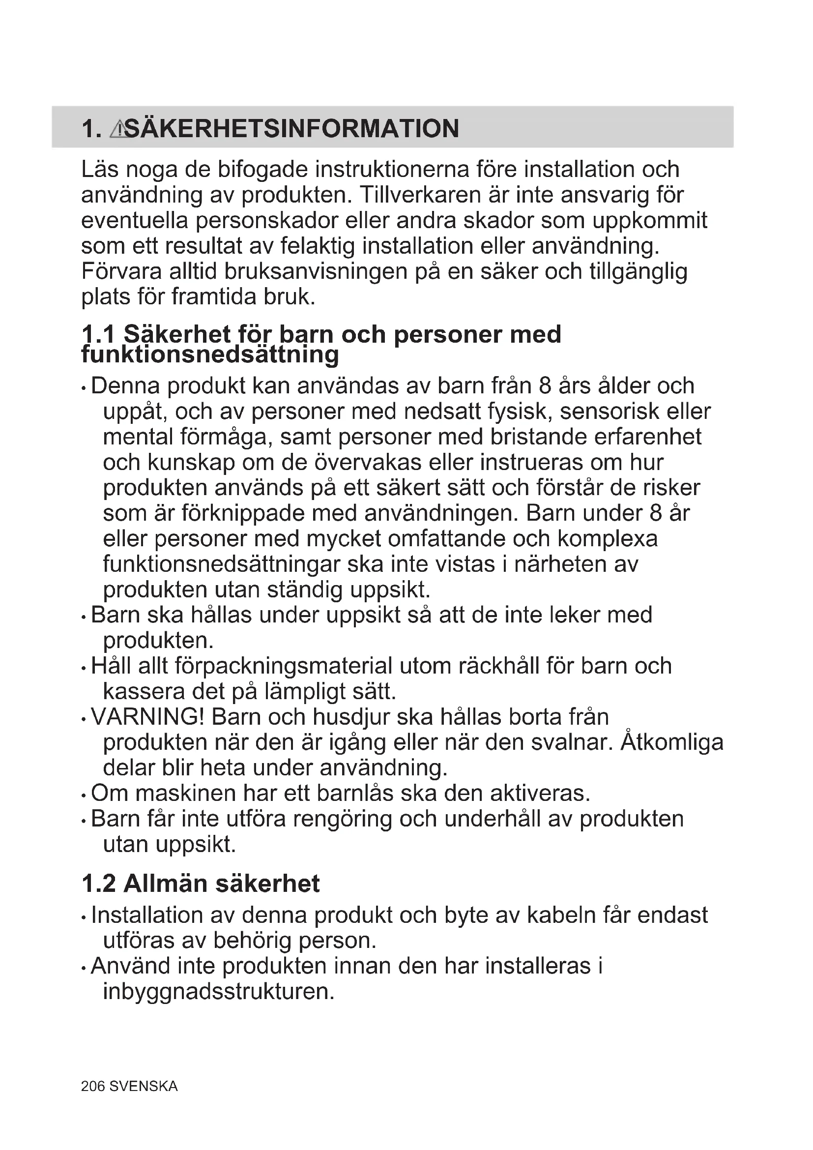 - Använd inte produkten innan den har installeras i inbyggnadsstrukturen. 206 SVENSKA• Bryt strömförsörjningen till apparaten före utförande av underhåll.