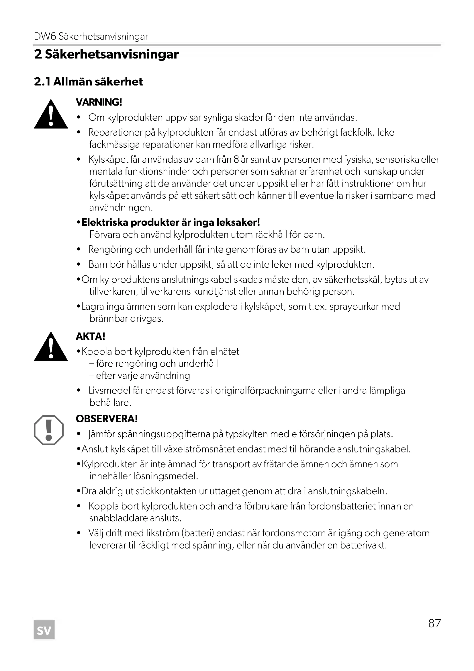 FARA! Observera: Beaktas anvisningen ej leder det till dödsfara eller svåra skador. VARNING! Observera: Beaktas anvisningen ej kan det leda till dödsfara eller svåra skador. AKTA! Observera: Beaktas anvisningen ej kan det leda till kroppsskador. OBSERVERA! Om anvisningarna inte beaktas kan det leda till materialskador och produktens funktion kan påverkas negativt. ANVISNING Kompletterande information om användning av produkten. DW6-O-16s.book Seite 86 Montag, 3. April 2017 4:04 16DW6 Säkerhetsanvisningar