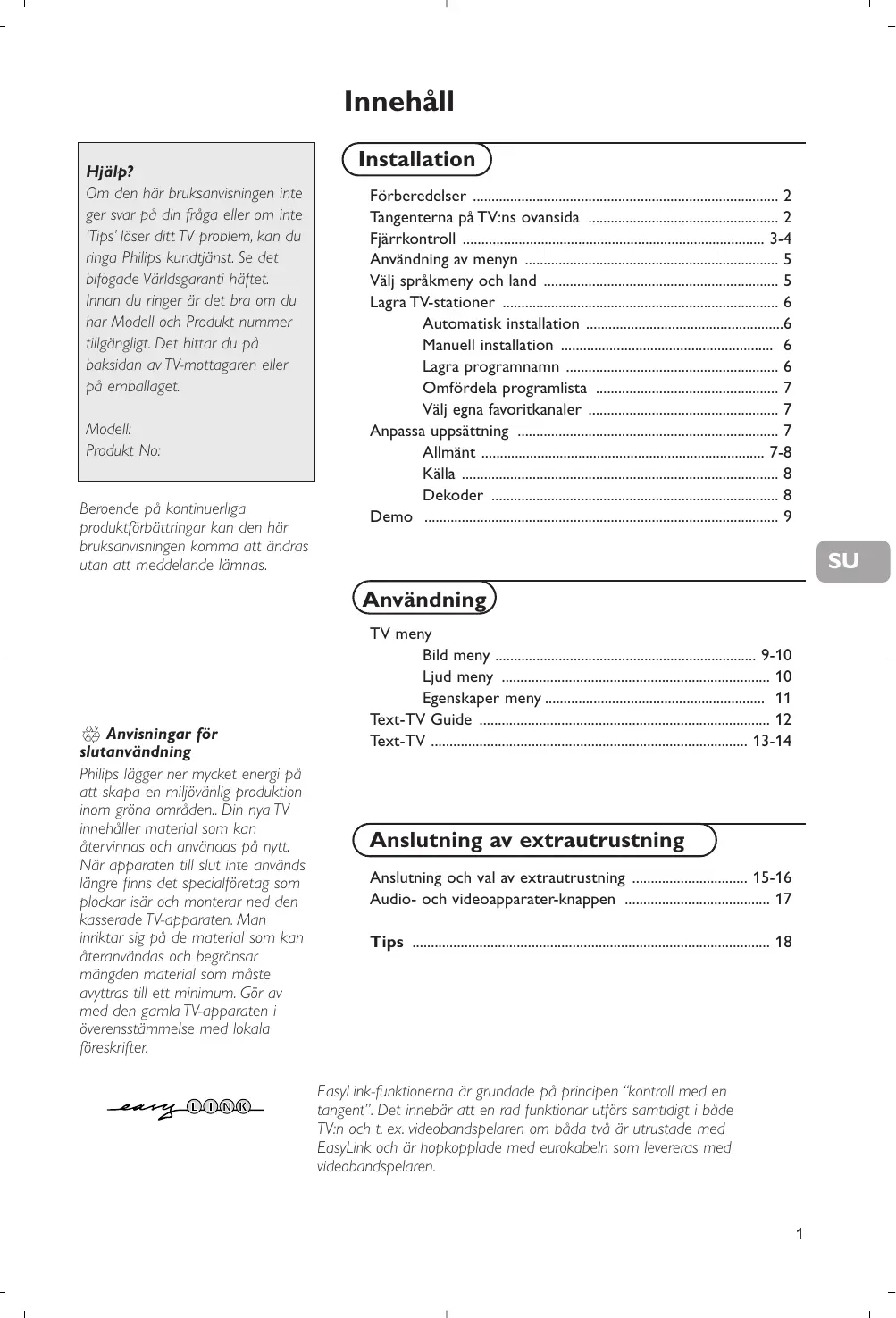 - Tips EasyLink-funktionerna är grundade på principen “kontroll med en tangent”. Det innebär att en rad funktionar utförs samtidigt i både TV:n och t. ex. videobandspelaren om båda två är utrustade med EasyLink och är hopkopplade med eurokabeln som levereras med videobandspelaren. p. 18