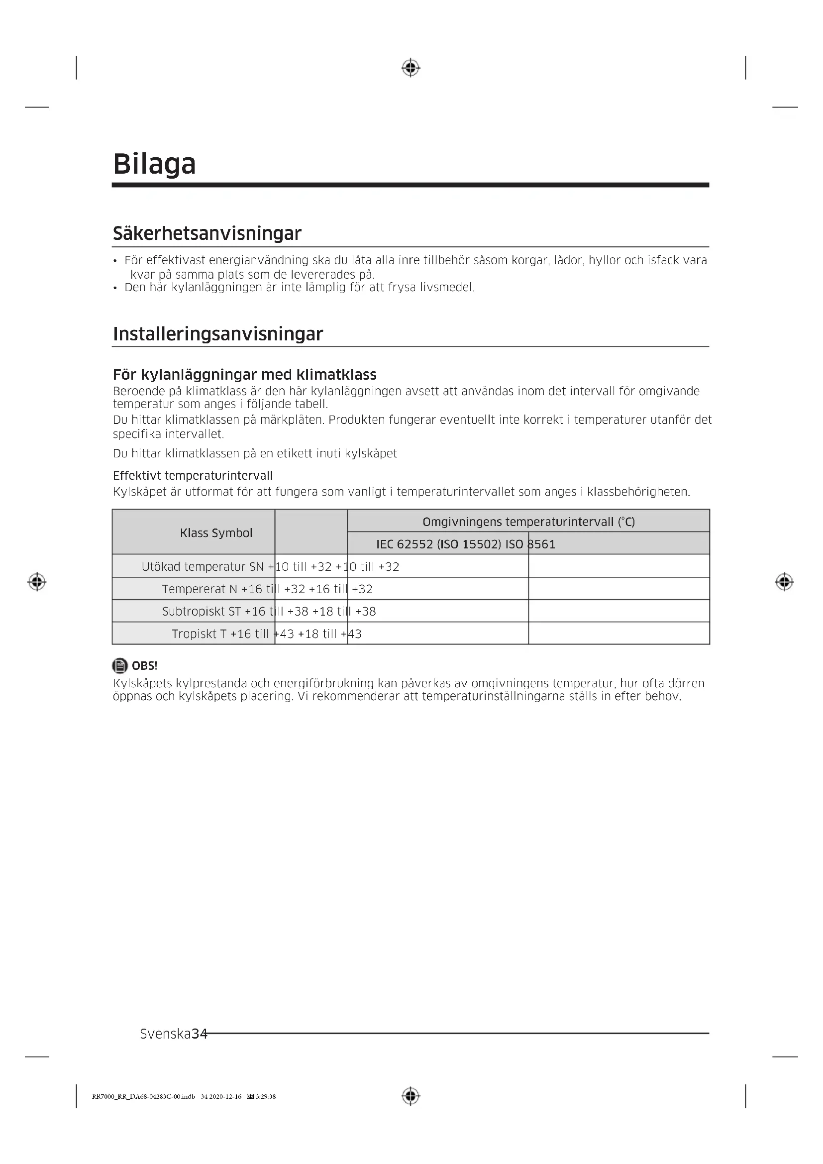 Utökad temperatur SN +10 till +32 +10 till +32 Tempererat N +16 till +32 +16 till +32 Subtropiskt ST +16 till +38 +18 till +38 Tropiskt T +16 till +43 +18 till +43 OBS! Kylskåpets kylprestanda och energiförbrukning kan påverkas av omgivningens temperatur, hur ofta dörren öppnas och kylskåpets placering. Vi rekommenderar att temperaturinställningarna ställs in efter behov. RR7000_RR_DA68-04283C-00.indb 34 2020-12-16 3:29:38Svenska 35 Temperaturanvisningar Rekommenderad temperatur Optimal temperatur för lagring av livsmedel: