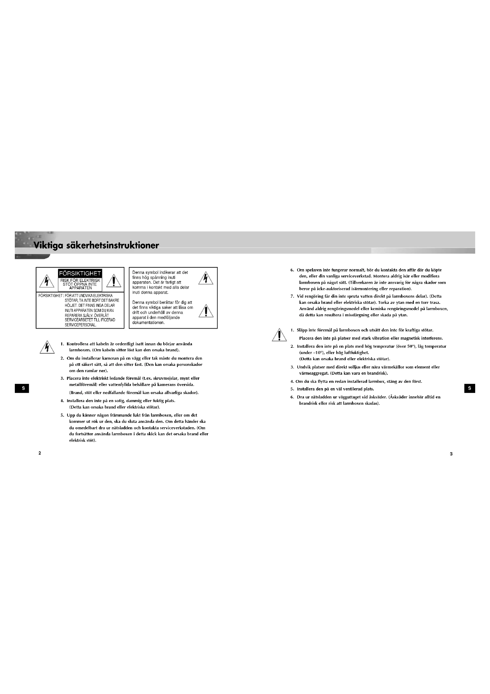 kommer ut rök ur den, ska du sluta använda den. Om detta händer ska du omedelbart dra ur nätsladden och kontakta serviceverkstaden. (Om du fortsätter använda larmboxen i detta skick kan det orsaka brand eller elektrisk stöt). Denna symbol indikerar att det finns hög spänning inuti apparaten. Det är farligt att komma i kontakt med alla delar inuti denna apparat. Denna symbol berättar för dig att det finns viktiga saker att läsa om drift och underhåll av denna apparat i den medföljande dokumentationen. FÖRSIKTIGHET RISK FÖR ELEKTRISKSTÖT ÖPPNA INTEAPPARATEN 00351A SOC-920P-SWE 11/19/03 2:57 PM Page 2S