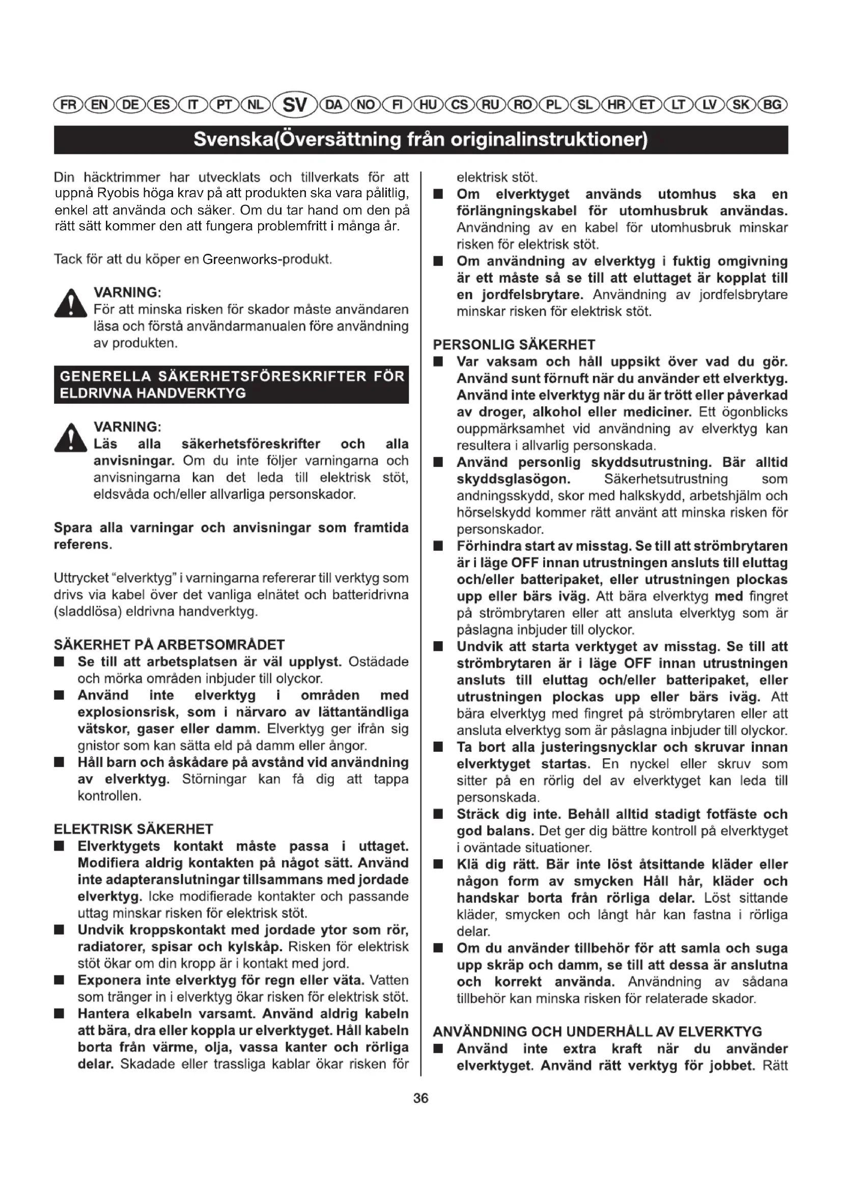 Tuppnå Ryobis höga krav på att produkten ska vara pålitlig, enkel att använda och säker. Om du tar hand om den på rätt sätt kommer den att fungera problemfritt i många år. GreenworksHåll enbart i elverktygets isolerade handtag eftersom skärklingan kan komma i kontakt med dolda "aktiva" ledningar eller sin egen kabel. Om klingan kommer i kontakt med "aktiv" ledning kan exponerade metalldelar bli strömförande och ge användaren en elektrisk stöt.Använd kraftiga skyddshandskar. Använd halkfria, kraftiga skyddshandskar när du arbetar med häcktrim- mern samt när du installerar eller tar bort klingor.Starta: Samtidigt trycker på bakre handtagets avtryckare (7) och sedan trycker in den främre avtryckaren (4). Stoppa: Släpp endera av bakre (7) och främre (4) avtryckare. 400W 50Hz