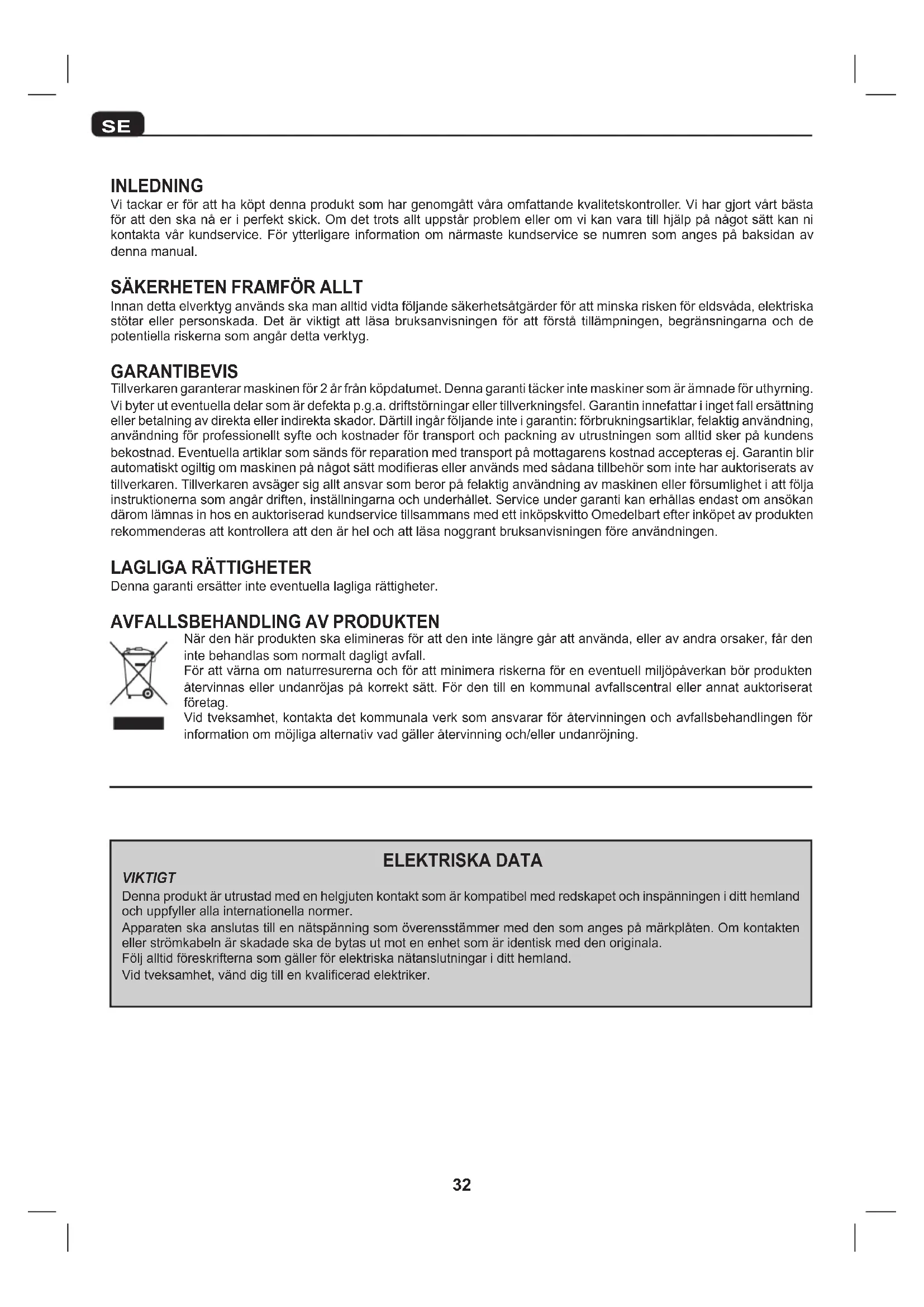 Innan detta elverktyg används ska man alltid vidta följande säkerhetsåtgärder för att minska risken för eldsvåda, elektriska stötar eller personskada. Det är viktigt att läsa bruksanvisningen för att förstå tillämpningen, begränsningarna och de potentiella riskerna som angår detta verktyg. GARANTIBEVIS Tillverkaren garanterar maskinen för 2 år från köpdatumet. Denna garanti täcker inte maskiner som är ämnade för uthyrning. Vi byter ut eventuella delar som är defekta p.g.a. driftstörningar eller tillverkningsfel. Garantin innefattar i inget fall ersättning eller betalning av direkta eller indirekta skador. Därtill ingår följande inte i garantin: förbrukningsartiklar, felaktig användning, användning för professionellt syfte och kostnader för transport och packning av utrustningen som alltid sker på kundens bekostnad. Eventuella artiklar som sänds för reparation med transport på mottagarens kostnad accepteras ej. Garantin blir automatiskt ogiltig om maskinen på något sätt modifieras eller används med sådana tillbehör som inte har auktoriserats av tillverkaren. Tillverkaren avsäger sig allt ansvar som beror på felaktig användning av maskinen eller försumlighet i att följa instruktionerna som angår driften, inställningarna och underhållet. Service under garanti kan erhållas endast om ansökan därom lämnas in hos en auktoriserad kundservice tillsammans med ett inköpskvitto Omedelbart efter inköpet av produkten rekommenderas att kontrollera att den är hel och att läsa noggrant bruksanvisningen före användningen.