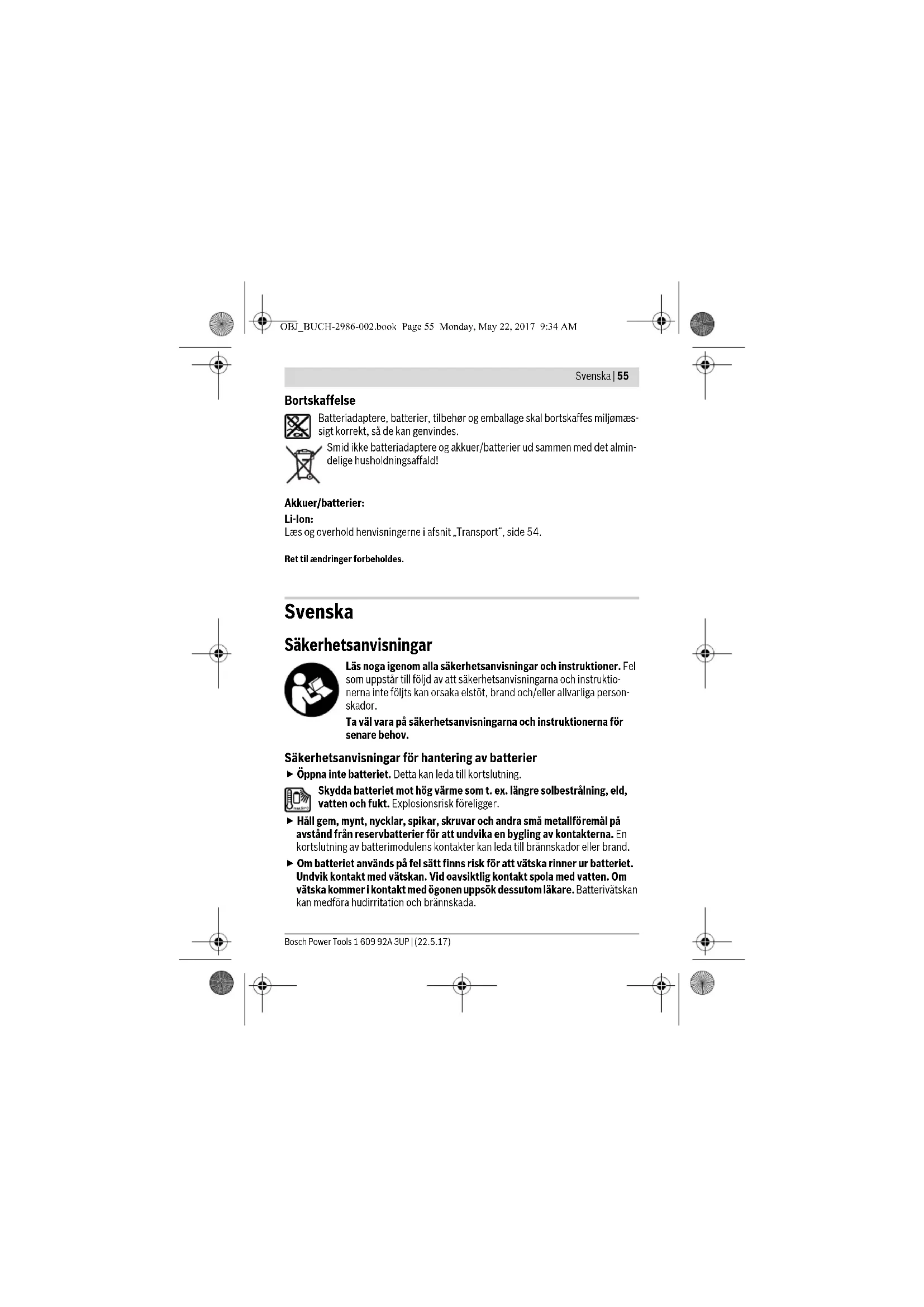 - Mange eksterne USB-enheder kan ikke oplades med batteriadapteren, selvom de tekniske data stemmer overens. OBJ_BUCH-2986-002.book Page 53 Monday, May 22, 2017 9:34 AM54 | Dansk 1 609 92A 3UP | (22.5.17) Bosch Power Tools Vedligeholdelse og service Kundeservice og brugerrådgivning Kundeservice besvarer dine spørgsmål vedr. reparation og vedligeholdelse af dit pro- dukt samt reservedele. Eksplosionstegninger og informationer om reservedele findes også under: www.bosch-pt.com Bosch brugerrådgivningsteamet vil gerne hjælpe dig med at besvare spørgsmål vedr. vores produkter og deres tilbehør. Produktets 10-cifrede typenummer (se typeskilt) skal altid angives ved forespørgsler og bestilling af reservedele. Dansk Bosch Service Center Telegrafvej 3 2750 Ballerup På www.bosch-pt.dk kan der online bestilles reservedele eller oprettes en reparati- ons ordre. Tlf. Service Center: 44898855 Fax: 44898755 E-Mail: vaerktoej@dk.bosch.com Transport De indeholdte Li-Ion-akkuer overholder bestemmelserne om farligt gods. Akkuerne kan transporteres af brugeren på offentlig vej uden yderligere pålæg. Ved forsendelse gennem tredjemand (f.eks.: lufttransport eller spedition) skal særli- ge krav vedr. emballage og mærkning overholdes. Her skal man kontakte en faregods- ekspert, før forsendelsesstykket forberedes. Send kun akkuer, hvis huset er ubeskadiget. Tilklæb åbne kontakter og indpak akkuen på en sådan måde, at den ikke kan bevæge sig i emballagen. Følg venligst også eventuelle, videreførende, nationale forskrifter. OBJ_BUCH-2986-002.book Page 54 Monday, May 22, 2017 9:34 AMSvenska | 55 Bosch Power Tools 1 609 92A 3UP | (22.5.17) Bortskaffelse Batteriadaptere, batterier, tilbehør og emballage skal bortskaffes miljømæs- sigt korrekt, så de kan genvindes. Smid ikke batteriadaptere og akkuer/batterier ud sammen med det almin- delige husholdningsaffald! Akkuer/batterier: Li-Ion: Læs og overhold henvisningerne i afsnit „Transport“, side 54. Ret til ændringer forbeholdes. Svenska Säkerhetsanvisningar Läs noga igenom alla säkerhetsanvisningar och instruktioner. Fel som uppstår till följd av att säkerhetsanvisningarna och instruktio- nerna inte följts kan orsaka elstöt, brand och/eller allvarliga person- skador. Ta väl vara på säkerhetsanvisningarna och instruktionerna för senare behov. Säkerhetsanvisningar för hantering av batterier Öppna inte batteriet. Detta kan leda till kortslutning. Skydda batteriet mot hög värme som t. ex. längre solbestrålning, eld, vatten och fukt. Explosionsrisk föreligger. Håll gem, mynt, nycklar, spikar, skruvar och andra små metallföremål på avstånd från reservbatterier för att undvika en bygling av kontakterna. En kortslutning av batterimodulens kontakter kan leda till brännskador eller brand. Om batteriet används på fel sätt finns risk för att vätska rinner ur batteriet. Undvik kontakt med vätskan. Vid oavsiktlig kontakt spola med vatten. Om vätska kommer i kontakt med ögonen uppsök dessutom läkare. Batterivätskan kan medföra hudirritation och brännskada. OBJ_BUCH-2986-002.book Page 55 Monday, May 22, 2017 9:34 AM56 | Svenska 1 609 92A 3UP | (22.5.17) Bosch Power Tools I skadat eller felanvänt batteri kan ångor uppstå. Tillför friskluft och uppsök läkare vid åkommor. Ångorna kan leda till irritation i andningsvägarna. Ladda batterierna endast i de laddare som tillverkaren rekommenderat. Om en laddare som är avsedd för en viss typ av batterier används för andra batterity- per finns risk för brand. Använd batteriet endast för produkter från Bosch. På så sätt skyddas batteriet mot farlig överbelastning. VAR FÖRSIKTIG! Använd endast de batterier som rekommenderas under ”Tekniska data”. Om andra batterier används föreligger explosionsrisk. Batteriet kan skadas av vassa föremål som t. ex. spikar eller skruvmejslar eller på grund av yttre påverkan. En intern kortslutning kan uppstå och rök, explosion eller överhettning kan förekomma hos batteriet. Sätt inte batteriet i adaptern om upplåsningsknapparna är defekta. Batteriet kan falla ut under drift. Förbrukade uppladdningsbara batterier skall lämnas till en miljövänlig åter- vinning. Beakta beträffande detta anvisningarna i avsnitten ”Transport” och ”Avfallshantering”. Produkt- och kapacitetsbeskrivning Batteriadaptern är till för ett Bosch 14,4 V eller ett 18 V-lithiumjonbatteri som ström- källa. Med batteriadaptern kan max två USB-enheter samt ett värmeelement för vär- mejackan försörjas med ström samtidigt. Illustrerade komponenter Numreringen av komponenterna hänvisar till illustrationen på grafiksidan. 1 Batteriadapter 2 USB-kontaktdon 3 Uttag för anslutningskontakten på värmejackans värmeelement 4 Bältesclips 5 Påslagningsknapp för aktivering av batteriadaptern 6 Batteri* 7 Batteriets upplåsningsknapp *I bruksanvisningen avbildat och beskrivet tillbehör ingår inte i standardleveransen. I vårt tillbehörsprogram beskrivs allt tillbehör som finns. OBJ_BUCH-2986-002.book Page 56 Monday, May 22, 2017 9:34 AMSvenska | 57 Bosch Power Tools 1 609 92A 3UP | (22.5.17) Tekniska data Drift Insättning och uttagning av batterimodulen (se bilderna A1 – A2) Använd inte våld när du sätter i batteriet. Batteriet är konstruerat så att det bara kan sättas in på rätt håll i adaptern. – För att sätta i batterierna 6, skjut in dem till anslag i adaptern 1. – För att ta ut batteriet 6, tryck på upplåsningsknappen 7 på batteriet och dra det ur adaptern 1. Batteriadapter GAA 18V-24 Produktnummer 1 600 A00 J.. USB-anslutning –Laddspänning – Laddström (max.)* vid 1 USB-enhet – Laddström (max.)* vid 2 USB-enheter