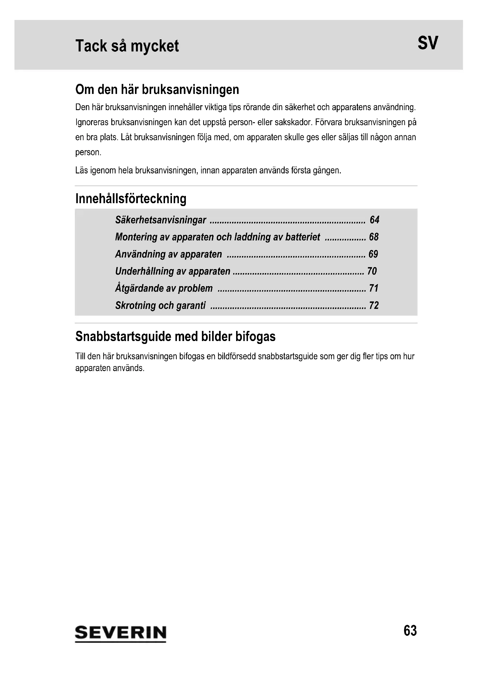 - Smaltimento separato dell’apparecchio e dell’accumulatore Gli apparecchi e gli accumulatori arrecanti questo simbolo devono essere smaltiti separatamente dai rifiuti domestici. Gli apparecchi e gli accumulatori contengono materie prime pregiate che possono essere riutilizzate. Lo smaltimento corretto pro- tegge l’ambiente e la salute delle persone. Consegnare separatamente per lo smal- timento nel relativo centro di raccolta l’apparecchio e l’accumulatore disassemblati. Garanzia Le condizioni di garanzia che seguono non pregiudicano i diritti alla prestazione in garanzia di legge nei confronti del venditore, né eventuali garanzie del venditore. Qualora si rendesse necessaria una riparazione, contattare telefonicamente o per e-mail la nostra Assistenza Clienti. I dettagli di contatto sono riportati nell’Allegato alle presenti istru- zioni per l’uso. In caso di ricorso alla garanzia, in alternativa rivolgersi anche direttamente al ri- venditore. SEVERIN concede inoltre una garanzia produttore di due anni a partire dalla data d’ac- quisto. In detto periodo viene effettuata senza spese l’eliminazione di tutti i difetti riconducibili in modo dimostrabile a difetti di materiale o di produzione e che compromettono in modo rilevante il funzionamento. Ogni altra rivendicazione è esclusa. Sono esclusi dalla garanzia: Danni riconducibili al mancato rispetto delle istruzioni per l’uso, all’uso non conforme o a normale usura, come pure particolari fragili come ad esempio vetro, plastica o lampadine o LED. Dalla garanzia sono inoltre esclusi batterie e accumulatori divenuti difettosi a se- guito della normale usura o uso non conforme, o la cui durata si è ridotta. In caso d’intervento da parte di soggetti non autorizzati da SEVERIN la garanzia decade.63 Tack så mycket 1 Tack så mycket Om den här bruksanvisningen Den här bruksanvisningen innehåller viktiga tips rörande din säkerhet och apparatens användning. Ignoreras bruksanvisningen kan det uppstå person- eller sakskador. Förvara bruksanvisningen på en bra plats. Låt bruksanvisningen följa med, om apparaten skulle ges eller säljas till någon annan person. Läs igenom hela bruksanvisningen, innan apparaten används första gången. Innehållsförteckning Säkerhetsanvisningar p. 64