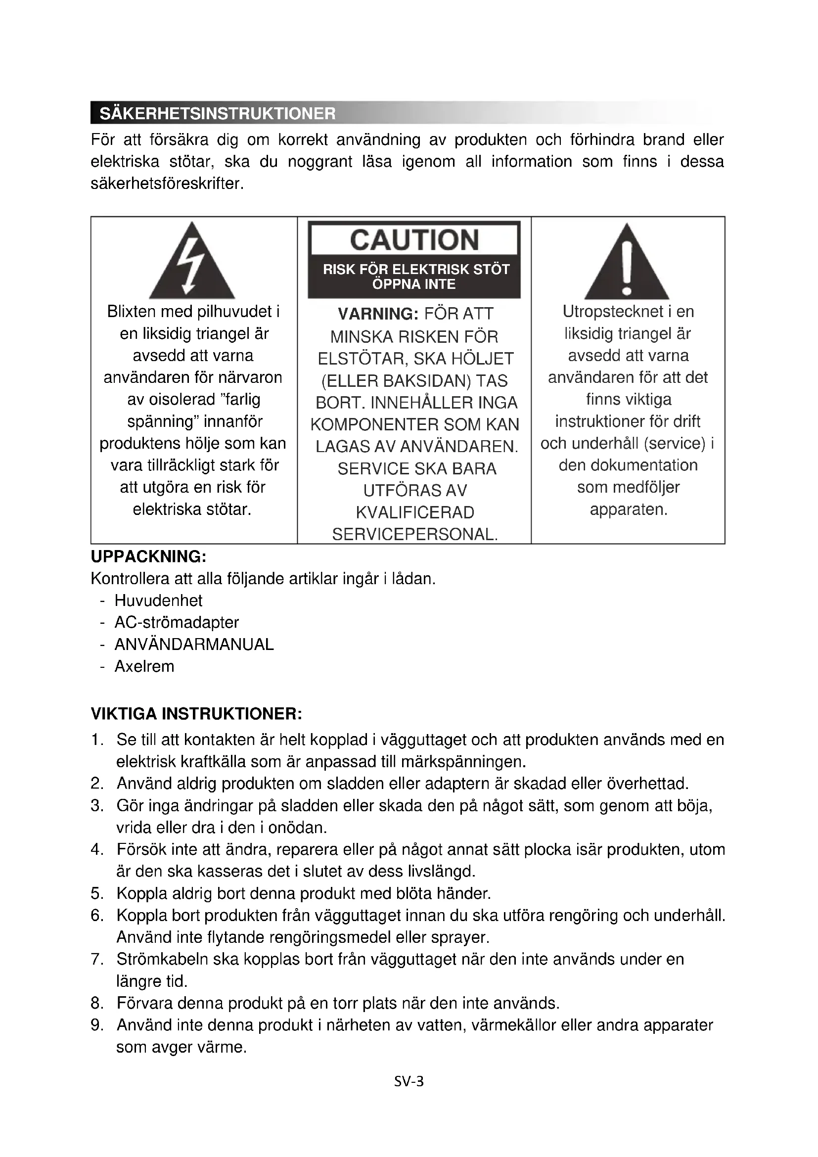 MINSKA RISKEN FÖR ELSTÖTAR, SKA HÖLJET (ELLER BAKSIDAN) TAS BORT. INNEHÄLLER INGA KOMPONENTER SOM KAN LAGAS AV ANVÄNDAREN. SERVICE SKA BARA UTFÖRAS AV KVALIFICERAD SERVICEPERSONAL.
