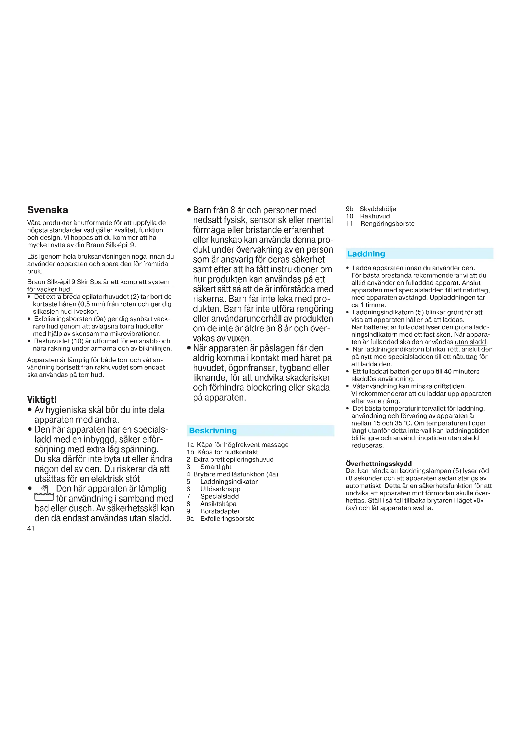 For varer kjøpt i Norge har kunden garanti i hen- hold til NEL’s Leveringsbetingelser. 96754506_SE9-941_MN_S6-92.indd 4096754506_SE9-941_MN_S6-92.indd 40 30.06.14 11:2730.06.14 11:27 CSS APPROVED Effective Date 17Jul2014 GMT - Printed 30Oct2014 Page 39 of 9141 Svenska Våra produkter är utformade för att uppfylla de högsta standarder vad gäller kvalitet, funktion och design. Vi hoppas att du kommer att ha mycket nytta av din Braun Silk·épil 9. Läs igenom hela bruksanvisningen noga innan du använder apparaten och spara den för framtida bruk. Braun Silk·épil 9 SkinSpa är ett komplett system för vacker hud: