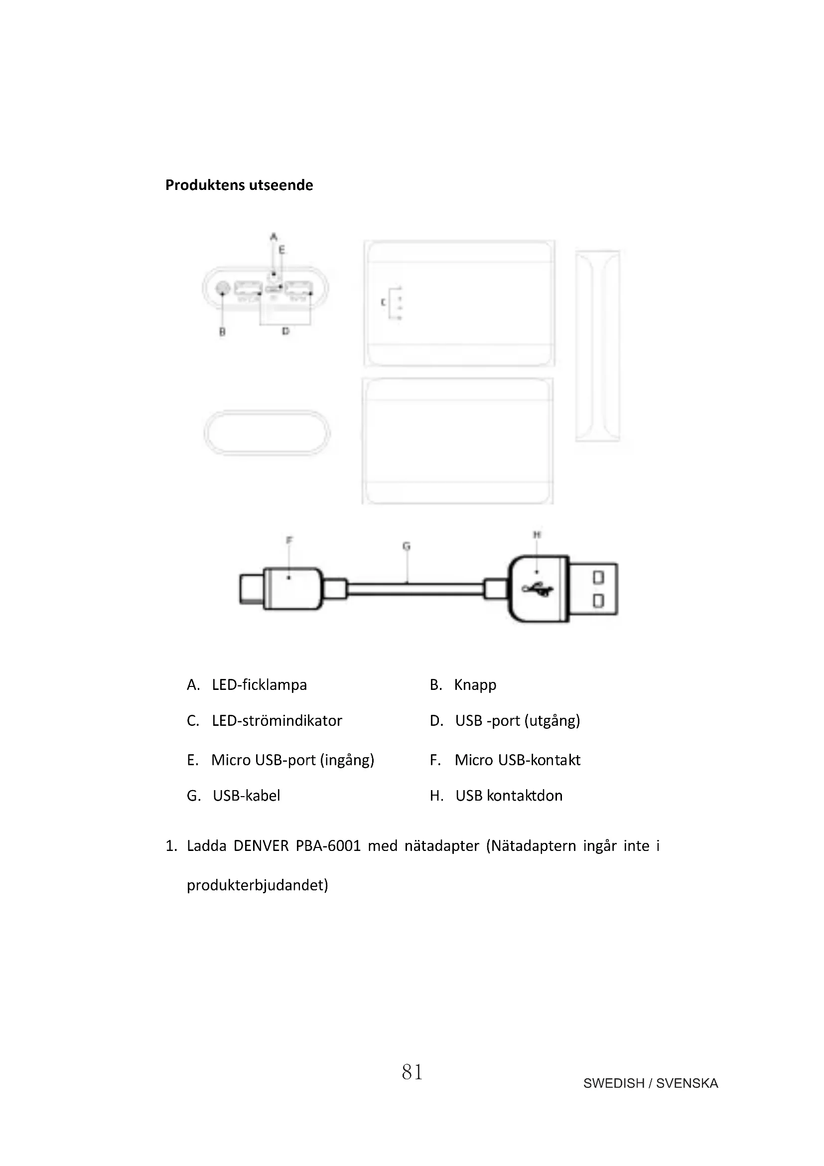 - Ladda DENVER PBA-6001 med nätadapter (Nätadaptern ingår inte iprodukterbjudandet)