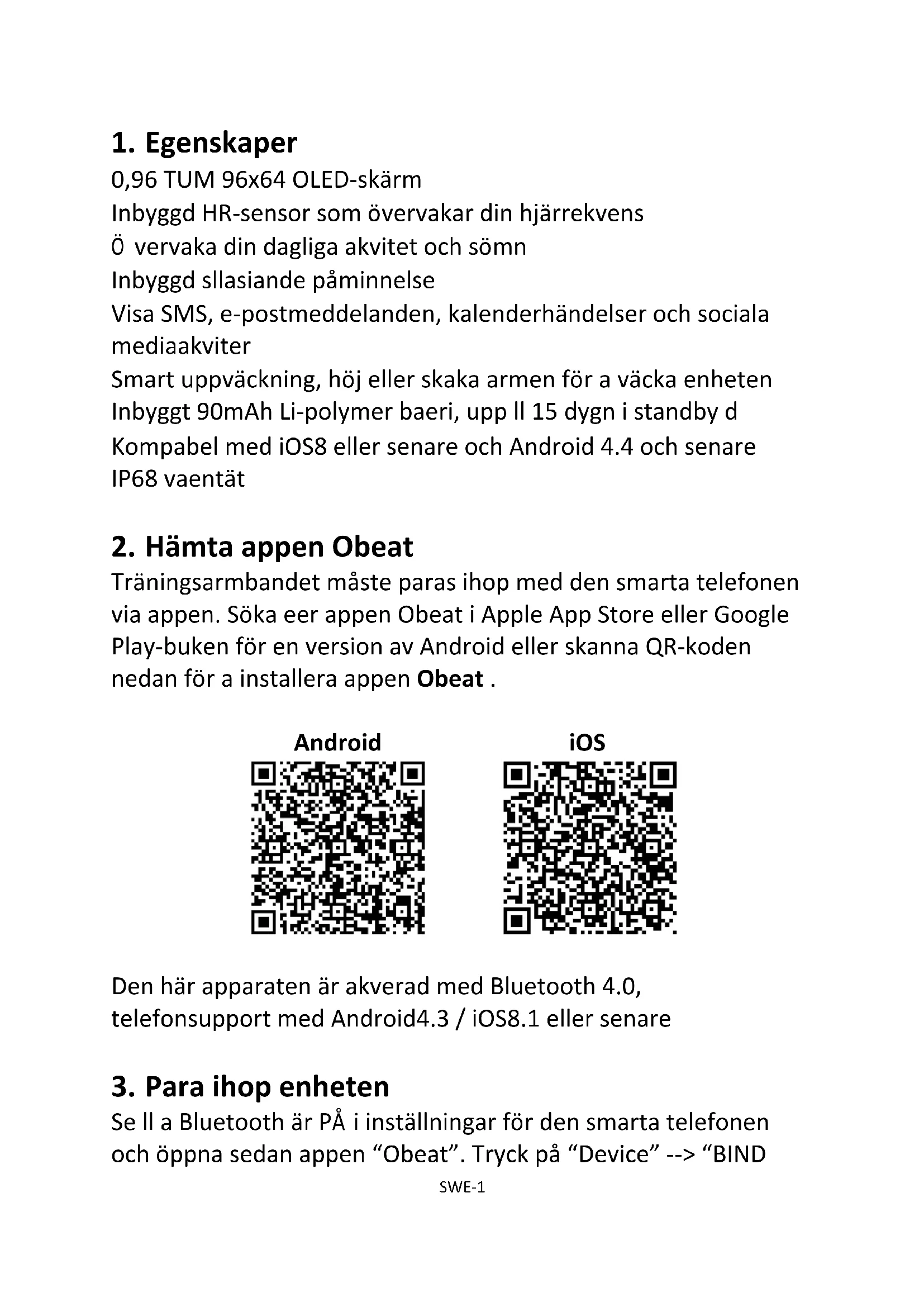 Träningsarmbandet måste paras ihop med den smarta telefonen via appen. Söka efter appen Obeat i Apple App Store eller Google Play-butiken för en version av Android eller skanna QR-koden nedan för att installera appen Obeat . Android iOS