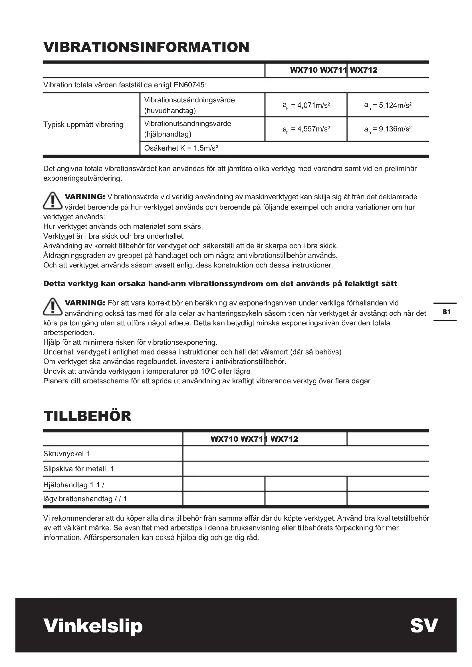 C eller lägre Planera ditt arbetsschema för att sprida ut användning av kraftigt vibrerande verktyg över era dagar. TILLBEHÖR WX710 WX711 WX712 Skruvnyckel 1 Slipskiva för metall 1 Hjälphandtag 1 1 / lågvibrationshandtag / / 1 Vi rekommenderar att du köper alla dina tillbehör från samma affär där du köpte verktyget. Använd bra kvalitetstillbehör av ett välkänt märke. Se avsnittet med arbetstips i denna bruksanvisning eller tillbehörets förpackning för mer information. Affärspersonalen kan också hjälpa dig och ge dig råd.Vinkelslip SV
