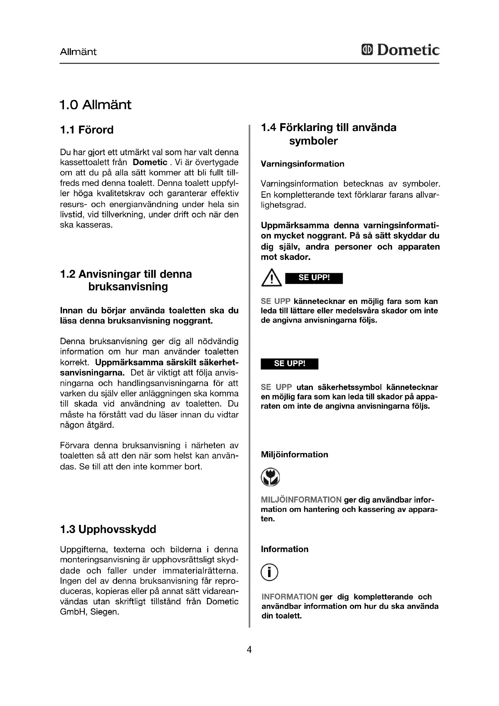 Du har gjort ett utmärkt val som har valt denna kassettoalett från Dometic . Vi är övertygade om att du på alla sätt kommer att bli fullt till- freds med denna toalett. Denna toalett uppfyl- ler höga kvalitetskrav och garanterar effektiv resurs- och energianvändning under hela sin livstid, vid tillverkning, under drift och när den ska kasseras.