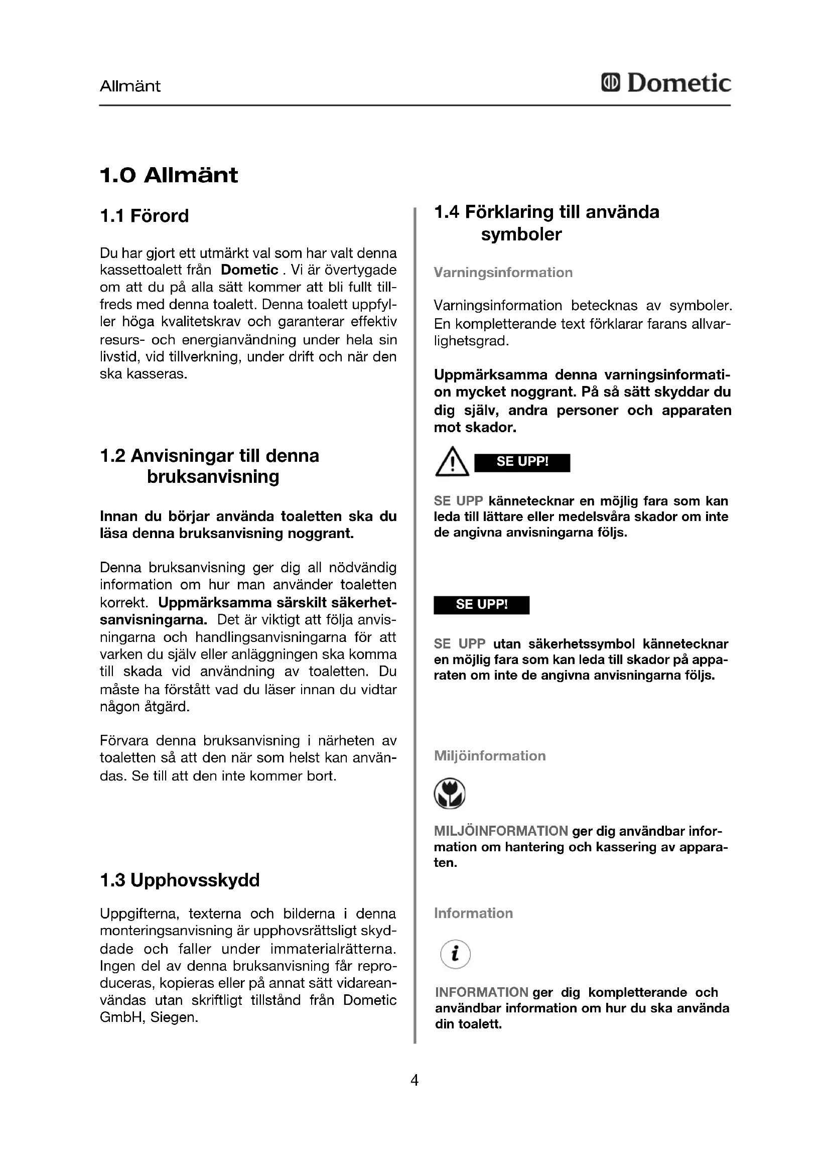Du har gjort ett utmärkt val som har valt denna kassettoalett från Dometic . Vi är övertygade om att du på alla sätt kommer att bli fullt till- freds med denna toalett. Denna toalett uppfyl- ler höga kvalitetskrav och garanterar effektiv resurs- och energianvändning under hela sin livstid, vid tillverkning, under drift och när den ska kasseras.