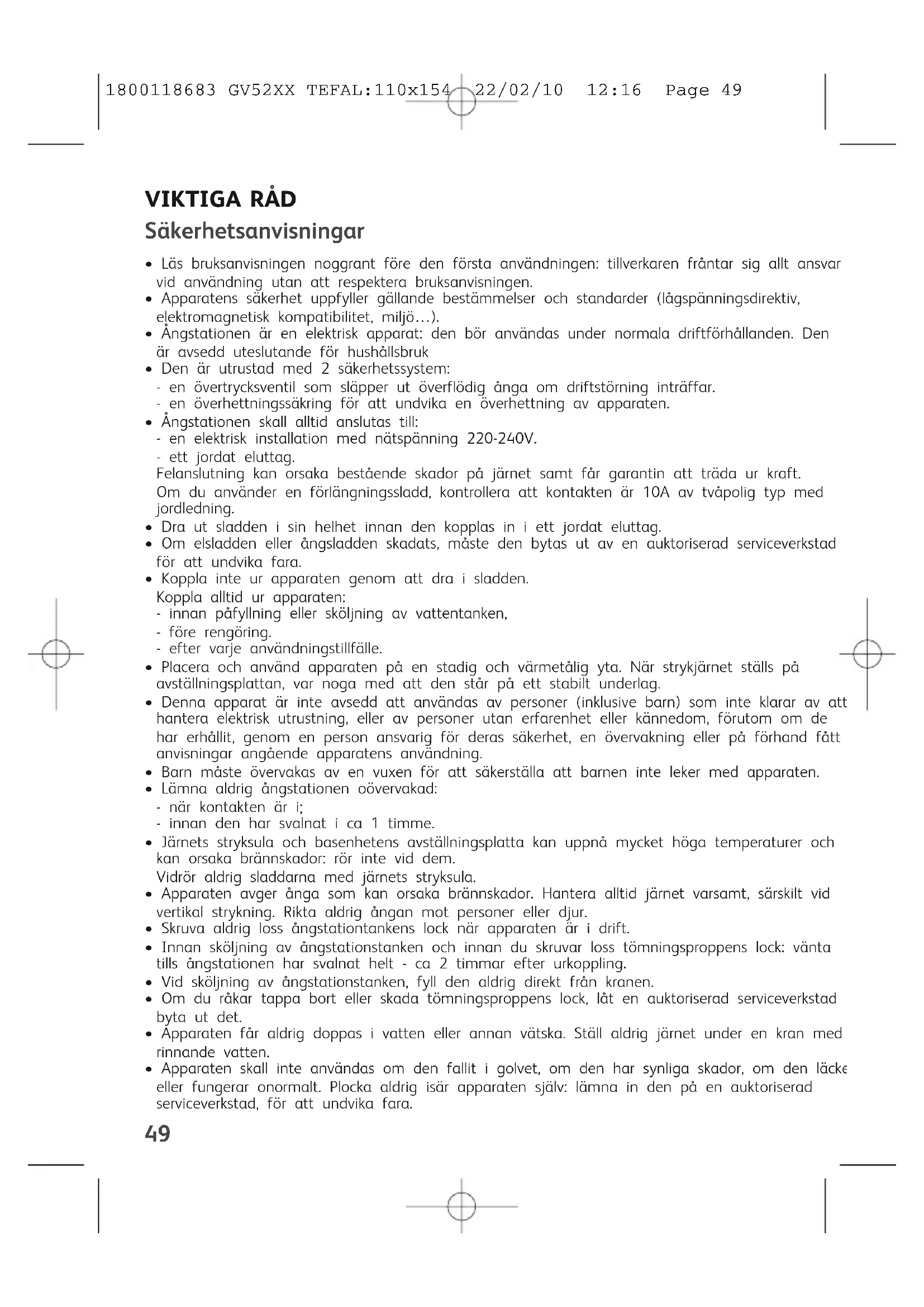 - Apparaten skall inte användas om den fallit i golvet, om den har synliga skador, om den läcker eller fungerar onormalt. Plocka aldrig isär apparaten själv: lämna in den på en auktoriserad serviceverkstad, för att undvika fara. 1800118683 GV52XX TEFAL:110x154 22/02/10 12:16 Page 4950