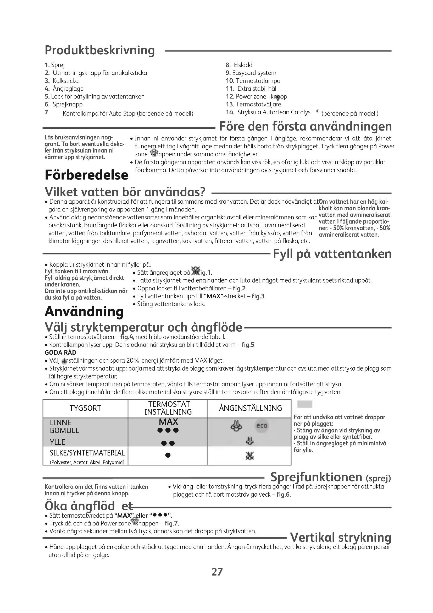 - Ställ in lämplig stryktemperatur beroende på tygsort.• Sätt ångreglaget på – fig.1.• Strykning kan påbörjas så fort kontrollampan slocknat. Plus funktioner Stryksula Autoclean Catalys