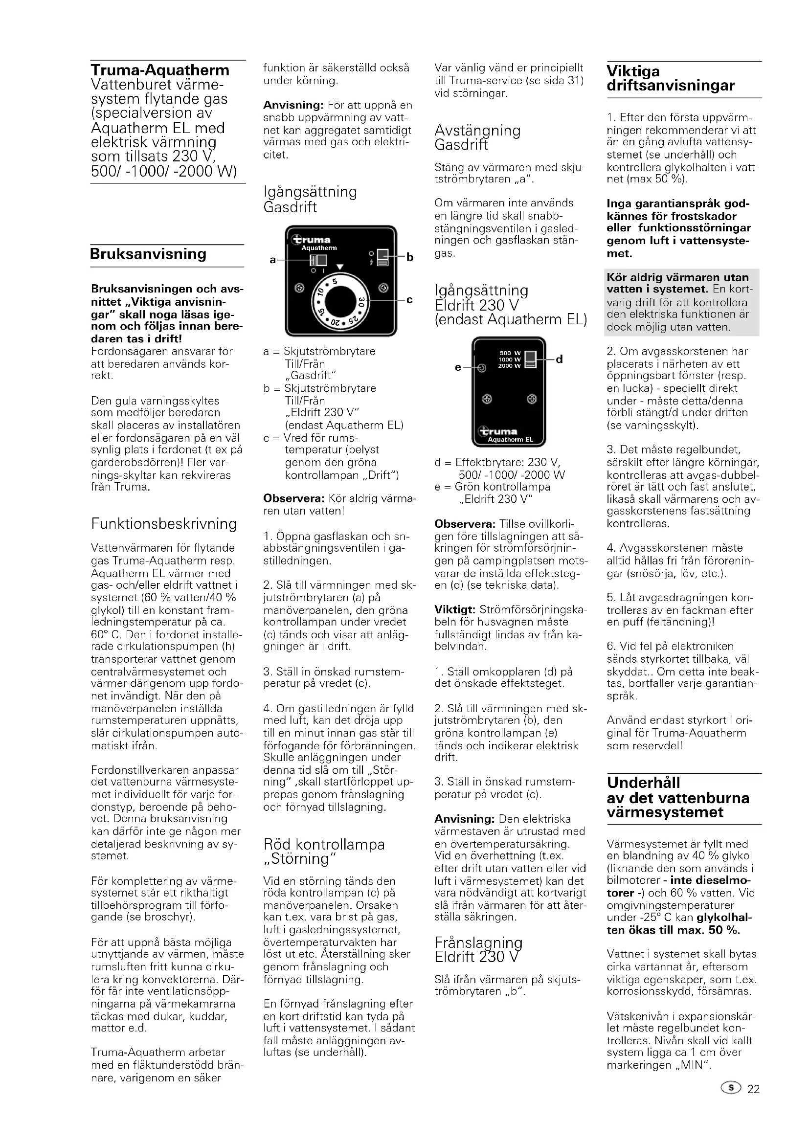 En Alemania, en caso de per- turbaciones, se informará siempre a la Central de Servi- cios de Truma en Putzbrunn/ München; en el extranjero se encuentran a su disposición los correspondientes Servici- os asociados (vea la guía de direcciones). Las reclamacio- nes se especificarán deteni- damente. Además, se presentará el certificado de garantía correctamente com- pletado o, se indicará el nú- mero de fábrica del aparato así como la fecha de adquisi- ción. Cuando se envíe el aparato a fábrica, el fabricante verifi- cará se existe una justifica- ción de reclamación por ga- rantía. En caso de daños en radiadores (intercambiador de calor) se enviará también el regulador de presión. Con el envío a fábrica, el transporte se efectuará nor- malmente como mercancía en pequeña velocidad. En caso de garantía, el fabrican- te se hace cargo de los co- stes de envío y reenvío. Si no existe caso de garantía, entonces el fabricante infor- mará al cliente y le indicará los costes de reparación que no serán por cuenta del fabri- cante; en este caso, los ga- stos de envío serán también a cargo del cliente.22 Bruksanvisningen och avs- nittet „Viktiga anvisnin- gar” skall noga läsas ige- nom och följas innan bere- daren tas i drift! Fordonsägaren ansvarar för att beredaren används kor- rekt. Den gula varningsskyltes som medföljer beredaren skall placeras av installatören eller fordonsägaren på en väl synlig plats i fordonet (t ex på garderobsdörren)! Fler var- nings-skyltar kan rekvireras från Truma. Funktionsbeskrivning Vattenvärmaren för flytande gas Truma-Aquatherm resp. Aquatherm EL värmer med gas- och/eller eldrift vattnet i systemet (60 % vatten/40 % glykol) till en konstant fram- ledningstemperatur på ca. 60° C. Den i fordonet installe- rade cirkulationspumpen (h) transporterar vattnet genom centralvärmesystemet och värmer därigenom upp fordo- net invändigt. När den på manöverpanelen inställda rumstemperaturen uppnåtts, slår cirkulationspumpen auto- matiskt ifrån. Fordonstillverkaren anpassar det vattenburna värmesyste- met individuellt för varje for- donstyp, beroende på beho- vet. Denna bruksanvisning kan därför inte ge någon mer detaljerad beskrivning av sy- stemet. För komplettering av värme- systemet står ett rikthaltigt tillbehörsprogram till förfo- gande (se broschyr). För att uppnå bästa möjliga utnyttjande av värmen, måste rumsluften fritt kunna cirku- lera kring konvektorerna. Där- för får inte ventilationsöpp- ningarna på värmekamrarna täckas med dukar, kuddar, mattor e.d. Truma-Aquatherm arbetar med en fläktunderstödd brän- nare, varigenom en säker funktion är säkerställd också under körning. Anvisning: För att uppnå en snabb uppvärmning av vatt- net kan aggregatet samtidigt värmas med gas och elektri- citet. Igångsättning Gasdrift a = Skjutströmbrytare Till/Från „Gasdrift“ b = Skjutströmbrytare Till/Från „Eldrift 230 V“ (endast Aquatherm EL) c = Vred för rums- temperatur (belyst genom den gröna kontrollampan „Drift“) Observera: Kör aldrig värma- ren utan vatten!