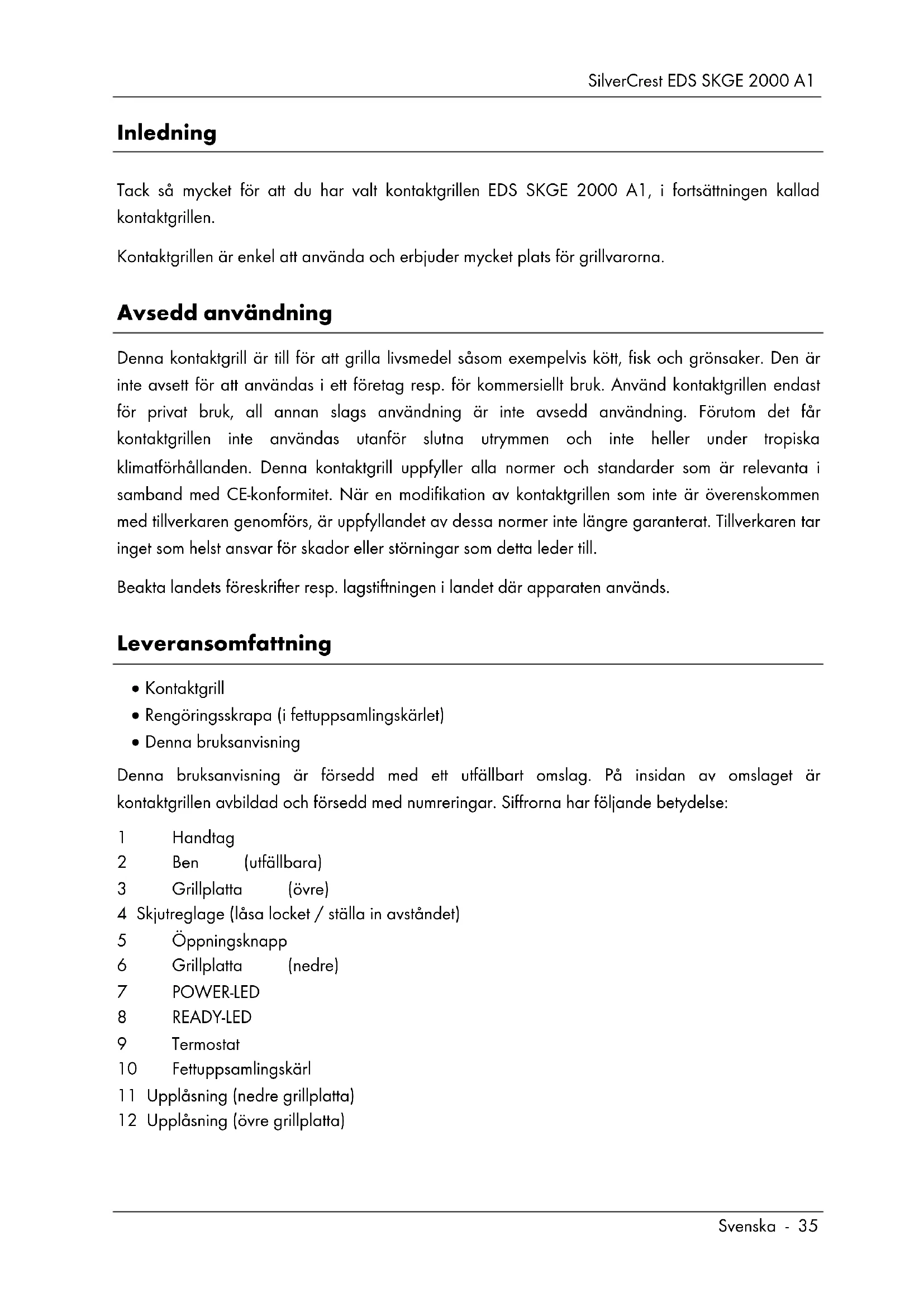 - Information om garanti och serviceprocedur SilverCrest EDS SKGE 2000 A1 Svenska - 35 Inledning Tack så mycket för att du har valt kontaktgrillen EDS SKGE 2000 A1, i fortsättningen kallad kontaktgrillen. Kontaktgrillen är enkel att använda och erbjuder mycket plats för grillvarorna. Avsedd användning Denna kontaktgrill är till för att grilla livsmedel såsom exempelvis kött, fisk och grönsaker. Den är inte avsett för att användas i ett företag resp. för kommersiellt bruk. Använd kontaktgrillen endast för privat bruk, all annan slags användning är inte avsedd användning. Förutom det får kontaktgrillen inte användas utanför slutna utrymmen och inte heller under tropiska klimatförhållanden. Denna kontaktgrill uppfyller alla normer och standarder som är relevanta i samband med CE-konformitet. När en modifikation av kontaktgrillen som inte är överenskommen med tillverkaren genomförs, är uppfyllandet av dessa normer inte längre garanterat. Tillverkaren tar inget som helst ansvar för skador eller störningar som detta leder till. Beakta landets föreskrifter resp. lagstiftningen i landet där apparaten används. Leveransomfattning Kontaktgrill Rengöringsskrapa (i fettuppsamlingskärlet) Denna bruksanvisning Denna bruksanvisning är försedd med ett utfällbart omslag. På insidan av omslaget är kontaktgrillen avbildad och försedd med numreringar. Siffrorna har följande betydelse: 1 Handtag 2 Ben (utfällbara) 3 Grillplatta (övre) 4 Skjutreglage (låsa locket / ställa in avståndet) 5 Öppningsknapp 6 Grillplatta (nedre) 7 POWER-LED 8 READY-LED 9 Termostat 10 Fettuppsamlingskärl 11 Upplåsning (nedre grillplatta) 12 Upplåsning (övre grillplatta)SilverCrest EDS SKGE 2000 A1 p. 48