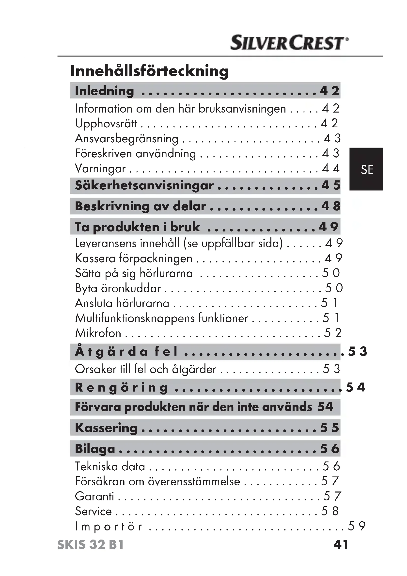 SKIS 32 B1 ■ Endast en kundtjänst som auktoriserats av tillver- karen får utföra reparationer på produkten under garantitiden, annars gäller inte garantin för ev. senare skador. ■ Defekta delar får endast bytas ut mot reservde- lar i original. Det är endast originaldelarna som uppfyller säkerhetskraven. ■ Gör inga egna ombyggnader eller förändringar på produkten. ■ Skydda hörlurarna mot fukt och låt det inte tränga in vätska i dem. ■ Använd inte hörlurarna i närheten av öppna lågor (t ex stearinljus). ■ FARA! Förpackningsmaterial är inga leksaker. Håll plastfolie, plastpåsar och annat förpackningsmaterial på avstånd från barnen. Det finns risk för kvävningsolyckor.47 SKIS 32 B1