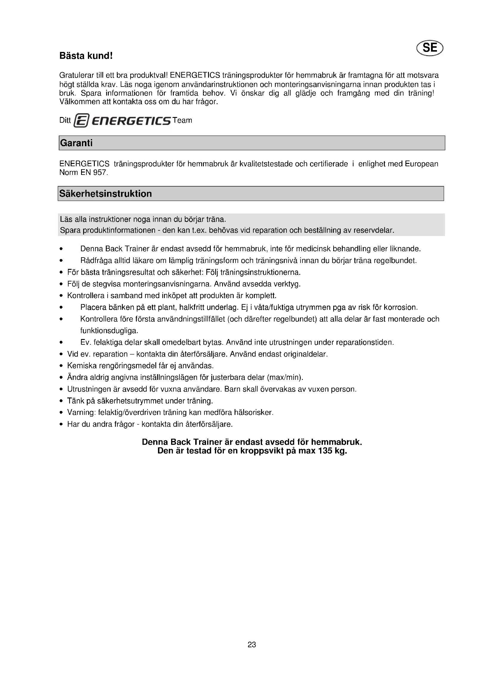 Bästa kund! Gratulerar till ett bra produktval! ENERGETICS träningsprodukter för hemmabruk är framtagna för att motsvara högt ställda krav. Läs noga igenom användarinstruktionen och monteringsanvisningarna innan produkten tas i bruk. Spara informationen för framtida behov. Vi önskar dig all glädje och framgång med din träning! Välkommen att kontakta oss om du har frågor. Ditt Team Garanti ENERGETICS träningsprodukter för hemmabruk är kvalitetstestade och certifierade i enlighet med European Norm EN 957. Säkerhetsinstruktion