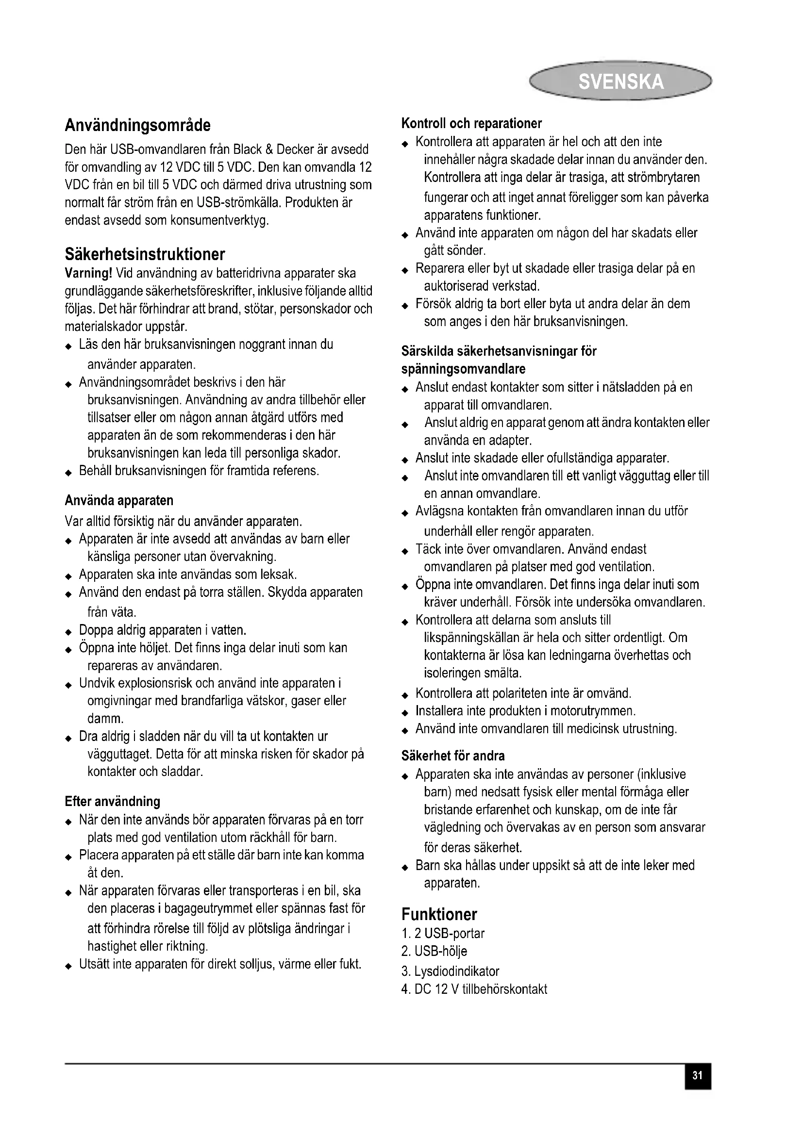Den har USB-omvandlaren fran Black & Decker ar avsedd for omvanding av 12 VDC till 5 VDC. Den kan omvandla 12 VDC fran en bil till 5 VDC och darmed driva utrustning som normalt farr strom fran en USB-strömkälla. Produktten ar endast avsedd som konsumterktyg.