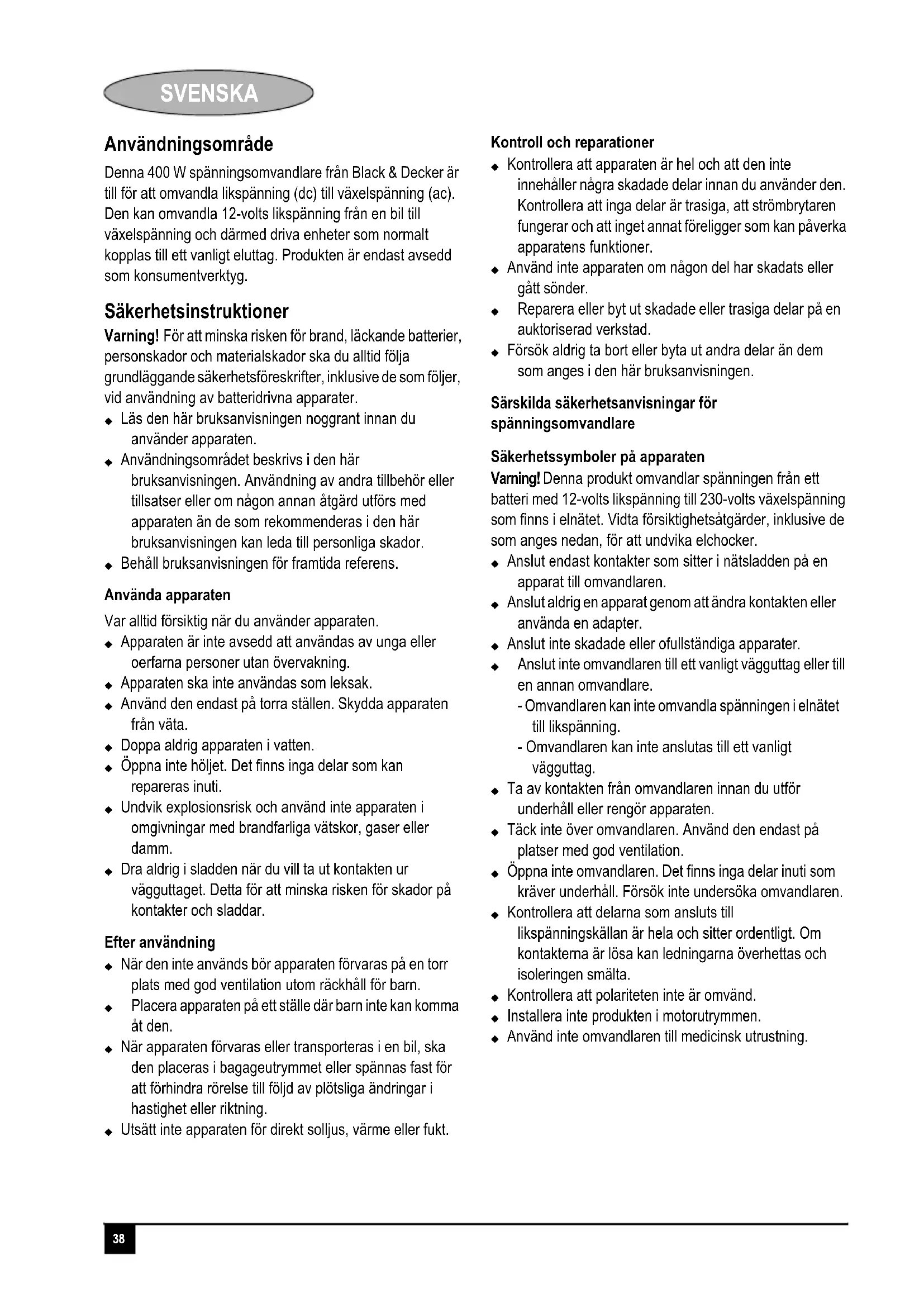 Denna 400 W spanningsomvandlare fran Black & Decker ar till for att omvandla likspanning (dc) till vaxelspanning (ac). Den kan omvandla 12-volts likspanning fran en bil till vaxelspanning och darmed driva enheter som normalt koplas till ett vanligt eluttag. Produktten ar endast avsedd som konsumterktyg.