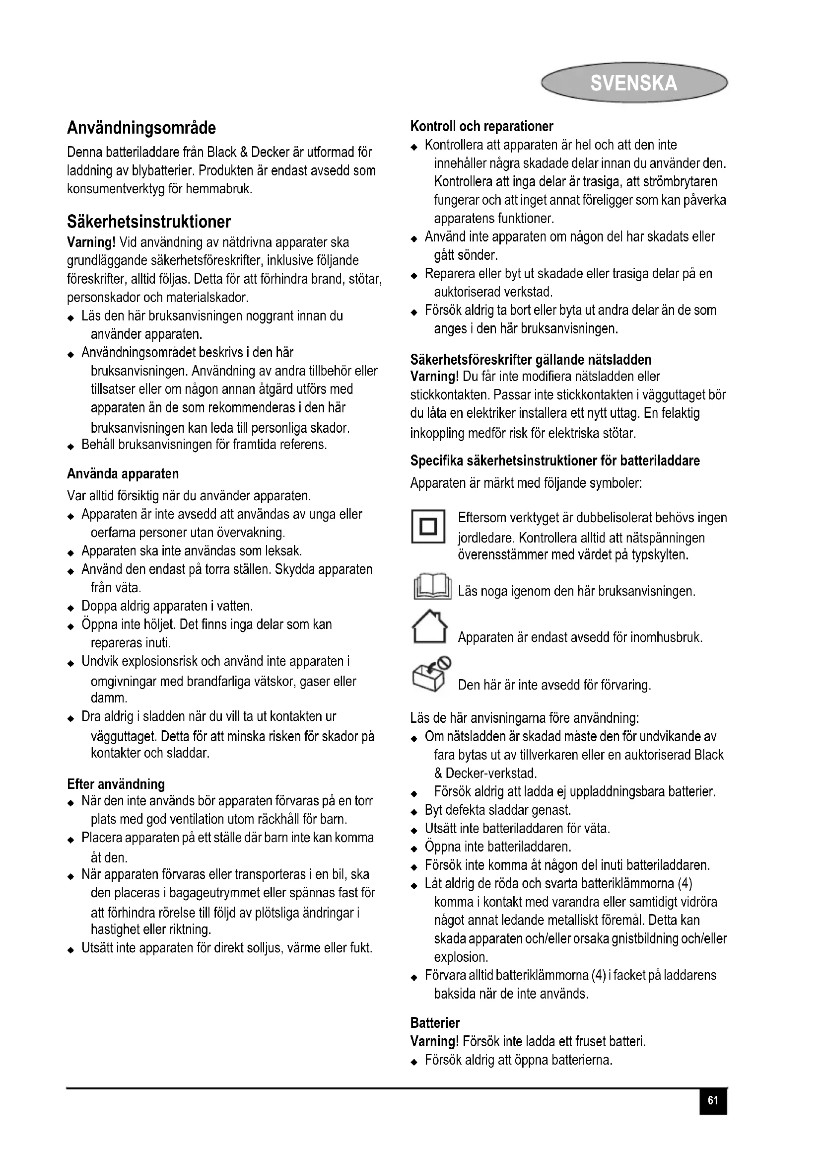 Ladda ner instruktionerna för din Batteriladdare i PDF-format gratis! Hitta din manual BDSBC25A - BLACK & DECKER och ta tillbaka ditt elektroniska enhet i hand. På denna sida publiceras alla dokument som behövs för att använda din enhet. BDSBC25A av märket BLACK & DECKER.