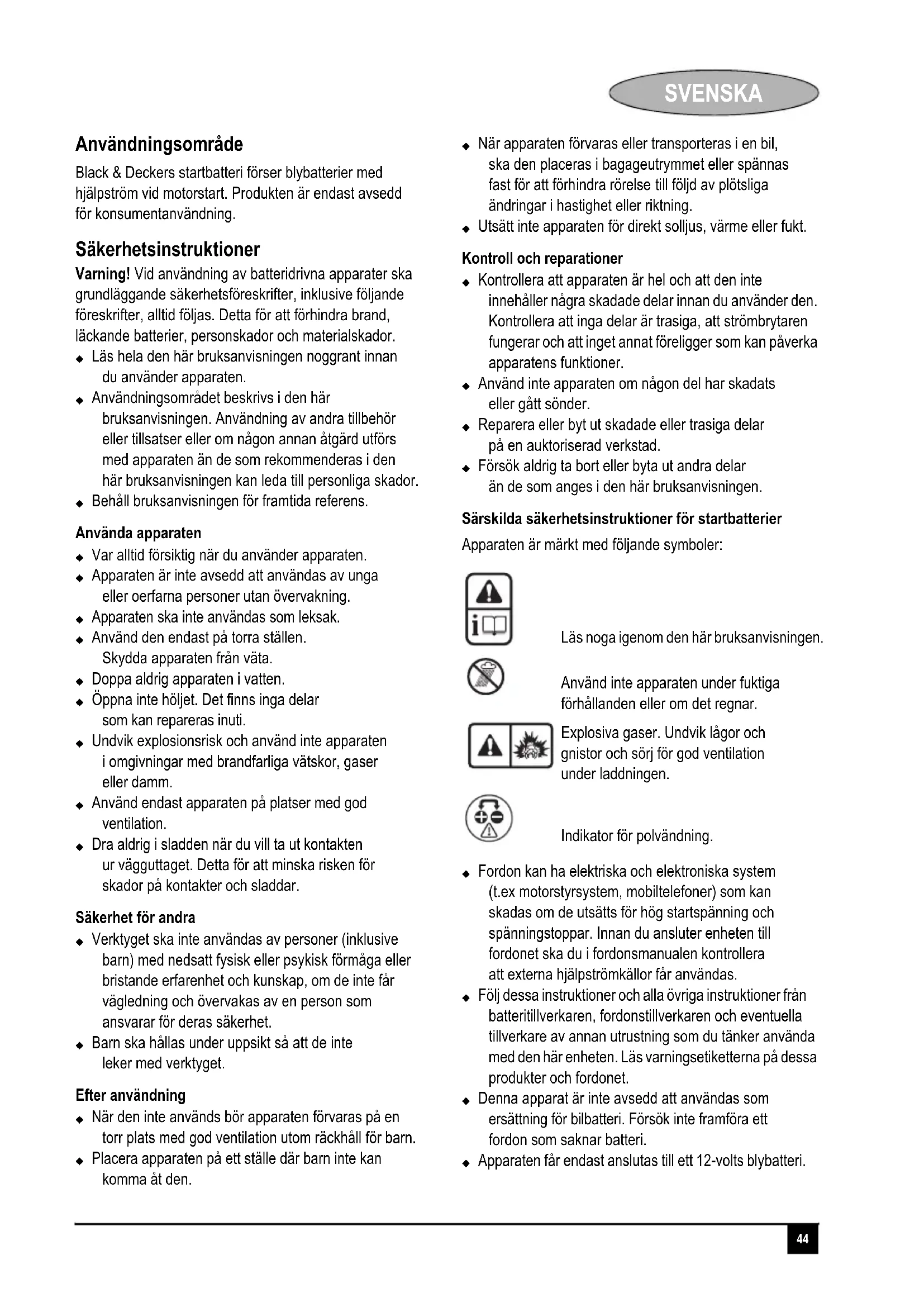 - Använd laddaren från Black & Decker endast för att ladda batteriet i den apparat som laddaren levererades med. Andra batterier kan spricka och orsaka personskador och andra skador.