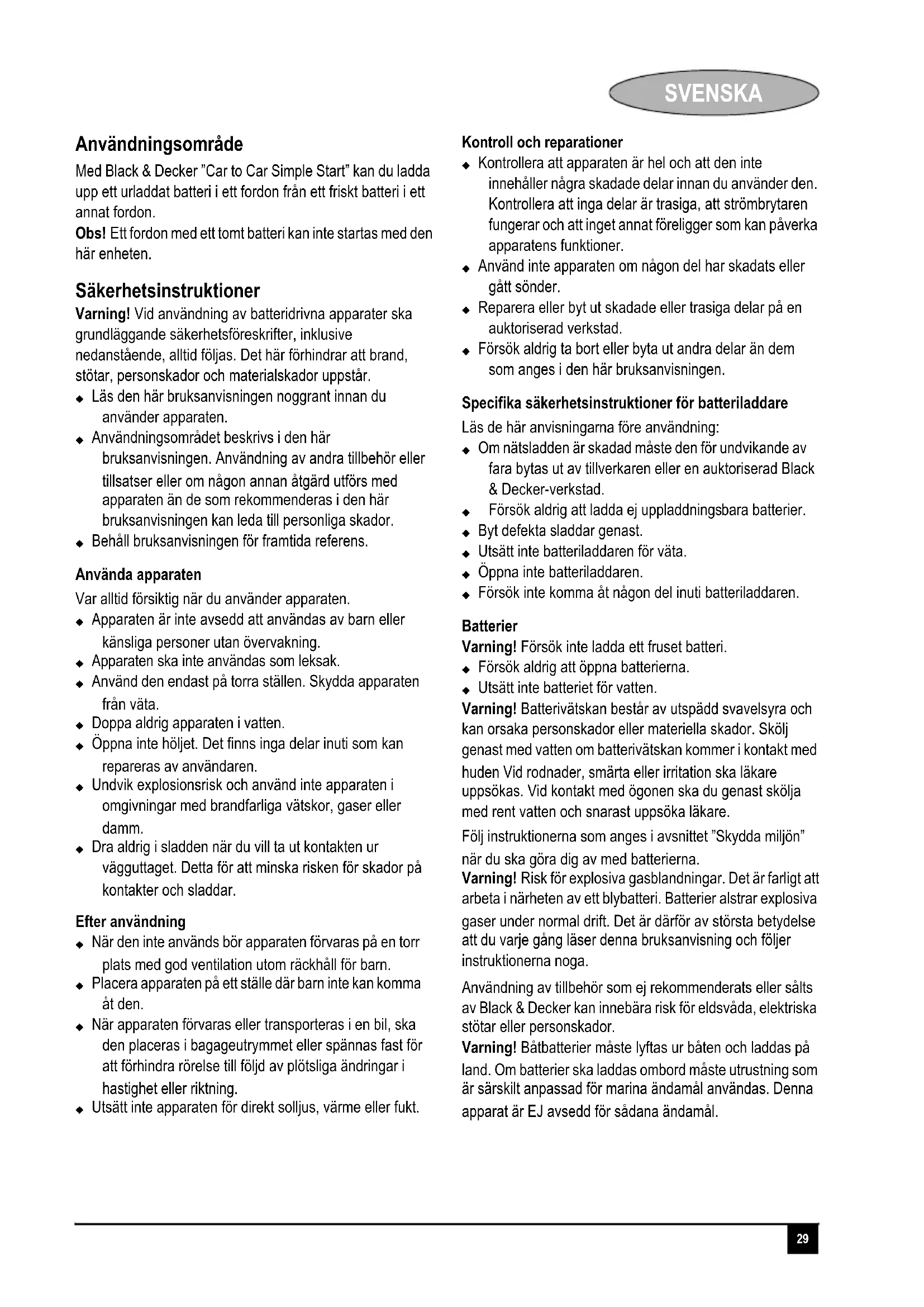 A Black & Decker declara que estes produtos estão em conformidade com: EN60335, EN60598 O signatário é responsável pela compilação do ficheiro técnico e efectua esta declaração em nome da Black & Decker Kevin Hewitt Director de Engenharia de Consumo Spennymoor, County Durham, DL16 6JG, Reino Unido 12-08-2008 Garantia A Black & Decker confia na qualidade dos seus produtos e oferece uma garantia excelente. Esta declaração de garantia é um complemento dos seus direitos estabelecidos por lei, não os prejudicando de forma alguma. A garantia é válida nos territórios dos Estados Membros da União Europeia e da Associação Europeia de Comércio Livre. Se um produto Black & Decker se avariar devido a defeitos de material, fabrico ou não conformidade, num período de 24 meses após a data da compra, a Black & Decker garante a substituição de peças defeituosas, a reparação de produtos sujeitos a um desgaste aceitável ou a substituição dos mesmos para garantir o mínimo de inconveniente ao cliente, excepto se: Recolha separada. Este produto não pode ser eliminado juntamente com os resíduos domésticos normais. BDBBC2C Voltagem de entrada Vdc 12 Voltagem de saída Vdc 14,5 Corrente de saída (máx.) A 7,5 Peso kg 1,9328 PORTUGUÊS X O produto tiver sido utilizado para fins comerciais, profissionais ou de aluguer. X O produto tiver sido submetido a utilização indevida ou descuido. X O produto tiver sido danificado por objectos estranhos, substâncias ou acidentes. X Tiverem sido efectuadas tentativas de reparação por pessoas que não sejam agentes de reparação autorizados ou técnicos de manutenção da Black & Decker. Para accionar a garantia, terá de apresentar comprovativos de compra ao vendedor ou a um agente de reparação autorizado. Pode verificar a localização do agente de reparação autorizado mais perto de si, contactando os escritórios locais da Black & Decker através do endereço indicado neste manual. Se preferir, pode encontrar na Internet uma lista de agentes de reparação autorizados Black & Decker, detalhes completos e contactos do serviço pós-venda, no endereço: www.2helpU.com Visite o nosso website www.blackanddecker.eu para registar o novo produto Black & Decker e manter-se actualizado relativamente a novos produtos e ofertas especiais. Pode encontrar mais informações sobre a marca Black & Decker e nossa gama de produtos em www.blackanddecker.eu.29 SVENSKA Svenska Användningsområde Med Black & Decker ”Car to Car Simple Start” kan du ladda upp ett urladdat batteri i ett fordon från ett friskt batteri i ett annat fordon. Obs! Ett fordon med ett tomt batteri kan inte startas med den här enheten. Säkerhetsinstruktioner Varning! Vid användning av batteridrivna apparater ska grundläggande säkerhetsföreskrifter, inklusive nedanstående, alltid följas. Det här förhindrar att brand, stötar, personskador och materialskador uppstår. X Läs den här bruksanvisningen noggrant innan du använder apparaten. X Användningsområdet beskrivs i den här bruksanvisningen. Användning av andra tillbehör eller tillsatser eller om någon annan åtgärd utförs med apparaten än de som rekommenderas i den här bruksanvisningen kan leda till personliga skador. X Behåll bruksanvisningen för framtida referens. Använda apparaten Var alltid försiktig när du använder apparaten. X Apparaten är inte avsedd att användas av barn eller känsliga personer utan övervakning. X Apparaten ska inte användas som leksak. X Använd den endast på torra ställen. Skydda apparaten från väta. X Doppa aldrig apparaten i vatten. X Öppna inte höljet. Det finns inga delar inuti som kan repareras av användaren. X Undvik explosionsrisk och använd inte apparaten i omgivningar med brandfarliga vätskor, gaser eller damm. X Dra aldrig i sladden när du vill ta ut kontakten ur vägguttaget. Detta för att minska risken för skador på kontakter och sladdar. Efter användning X När den inte används bör apparaten förvaras på en torr plats med god ventilation utom räckhåll för barn. X Placera apparaten på ett ställe där barn inte kan komma åt den. X När apparaten förvaras eller transporteras i en bil, ska den placeras i bagageutrymmet eller spännas fast för att förhindra rörelse till följd av plötsliga ändringar i hastighet eller riktning. X Utsätt inte apparaten för direkt solljus, värme eller fukt. Kontroll och reparationer X Kontrollera att apparaten är hel och att den inte innehåller några skadade delar innan du använder den. Kontrollera att inga delar är trasiga, att strömbrytaren fungerar och att inget annat föreligger som kan påverka apparatens funktioner. X Använd inte apparaten om någon del har skadats eller gått sönder. X Reparera eller byt ut skadade eller trasiga delar på en auktoriserad verkstad. X Försök aldrig ta bort eller byta ut andra delar än dem som anges i den här bruksanvisningen. Specifika säkerhetsinstruktioner för batteriladdare Läs de här anvisningarna före användning: X Om nätsladden är skadad måste den för undvikande av fara bytas ut av tillverkaren eller en auktoriserad Black & Decker-verkstad. X Försök aldrig att ladda ej uppladdningsbara batterier. X Byt defekta sladdar genast. X Utsätt inte batteriladdaren för väta. X Öppna inte batteriladdaren. X Försök inte komma åt någon del inuti batteriladdaren. Batterier Varning! Försök inte ladda ett fruset batteri. X Försök aldrig att öppna batterierna. X Utsätt inte batteriet för vatten. Varning! Batterivätskan består av utspädd svavelsyra och kan orsaka personskador eller materiella skador. Skölj genast med vatten om batterivätskan kommer i kontakt med huden Vid rodnader, smärta eller irritation ska läkare uppsökas. Vid kontakt med ögonen ska du genast skölja med rent vatten och snarast uppsöka läkare. Följ instruktionerna som anges i avsnittet ”Skydda miljön” när du ska göra dig av med batterierna. 