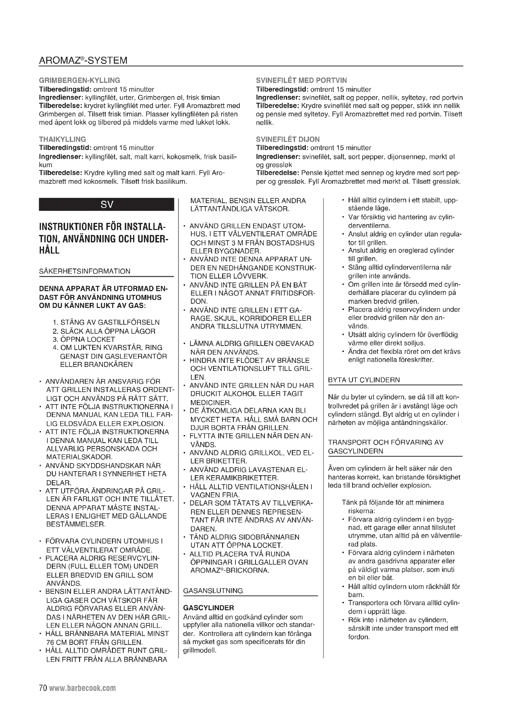 -SYSTEMET GRIMBERGEN-KYCKLING Tillagningstid: ca 15 minuter Ingredienser: kycklingfilé, grillkrydda, Grimbergen-öl, färsk timjan Tillagning: Krydda kycklingfilén med grillkryddor. Fyll Aromaz- brickorna med Grimbergen-öl och tillsätt färsk timjan. Lägg kyck- lingen på gallret med öppet lock och tillaga på medelstark värme med stängt lock. THAI-KYCKLING Tillagningstid: ca 15 minuter Ingredienser: kycklingfilé, salt, curry, kokosmjölk, färsk basilika Tillagning: Krydda kycklingen med salt och curry. Fyll Aromaz- brickorna med kokosmjölk och tillsätt färsk basilika. Man_Brahma_5.2_090924_A.indd 74 24/09/09 15:38www.barbecook.com 75