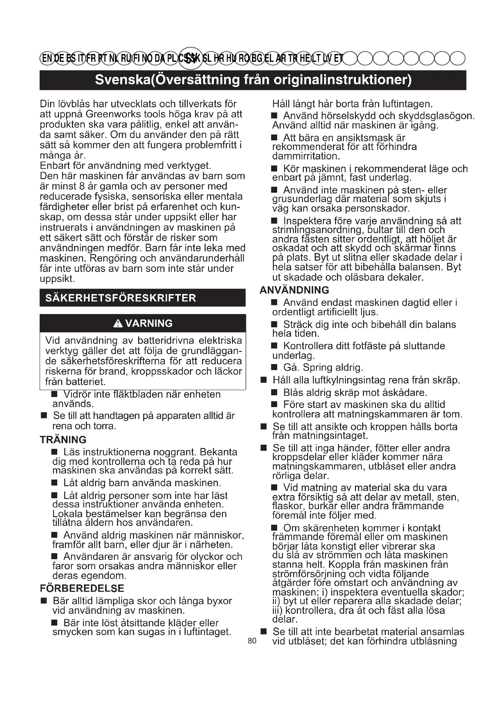 EN DE ES IT FR PT NL RU FI NO DA PL CS SK SL HR HU RO BG EL AR TR HE LT LV ET Din lövblås har utvecklats och tillverkats för att uppnå Greenworks tools höga krav på att produkten ska vara pålitlig, enkel att använ- da samt säker. Om du använder den på rätt sätt så kommer den att fungera problemfritt i många år. Enbart för användning med verktyget. Den här maskinen får användas av barn som är minst 8 år gamla och av personer med reducerade fysiska, sensoriska eller mentala färdigheter eller brist på erfarenhet och kun- skap, om dessa står under uppsikt eller har instruerats i användningen av maskinen på ett säkert sätt och förstår de risker som användningen medför. Barn får inte leka med maskinen. Rengöring och användarunderhåll får inte utföras av barn som inte står under uppsikt.