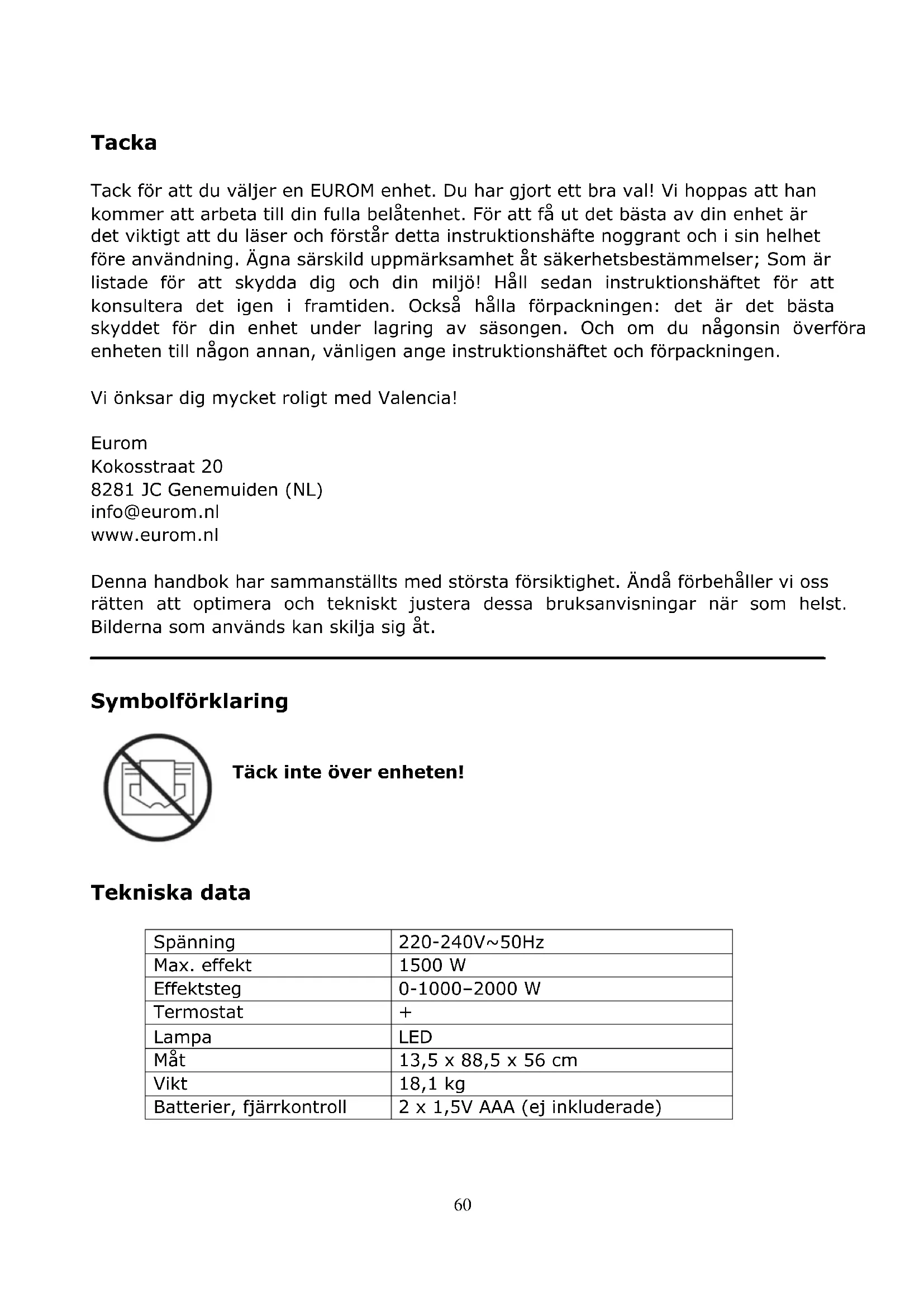 BRUKSANVISNING Valencia Eurom