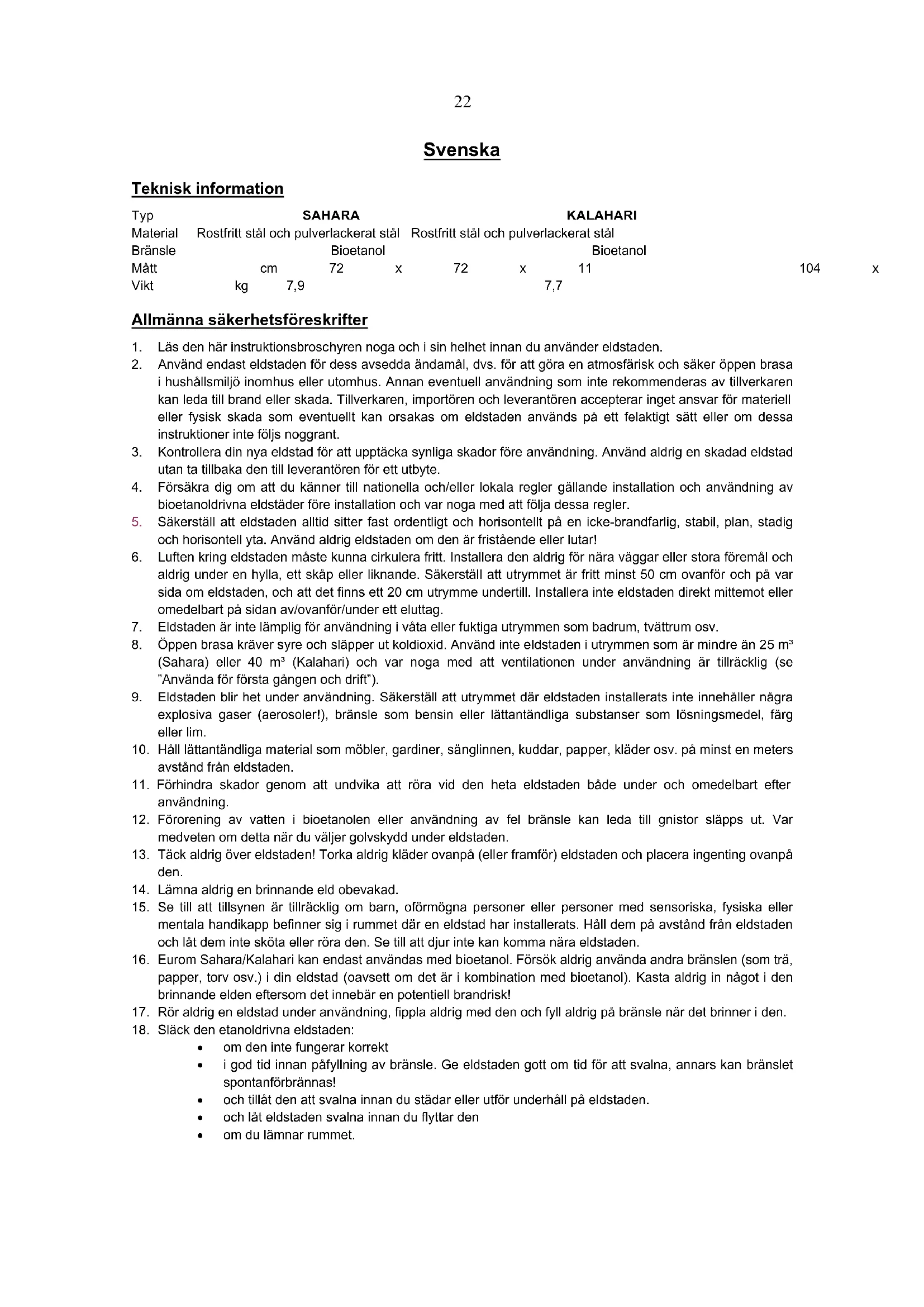 - Eldstaden är nu redo för användning. Bränsle Eldstaden EUROM Sahara/Kalahari använder flytande (eller gelbaserad) bioetanol. Detta är ett miljövänligt, luktfritt, vegetabiliskt baserat bränsle med låga koldioxidutsläpp. Bioetanol av god kvalitet förbränns helt (lämnar ingen aska) och ger en mjuk låga utan att fräsa eller skapa gnistor. Bioetanol finns i järnaffärer och liknande i olika typer av förpackningar. Det är inte tillåtet att använda andra bränslen i den här eldstaden. Förvara inte stora kvantiteter av bioetanol och förvara det utom räckhåll för barn.25 Använda för första gången och drift
