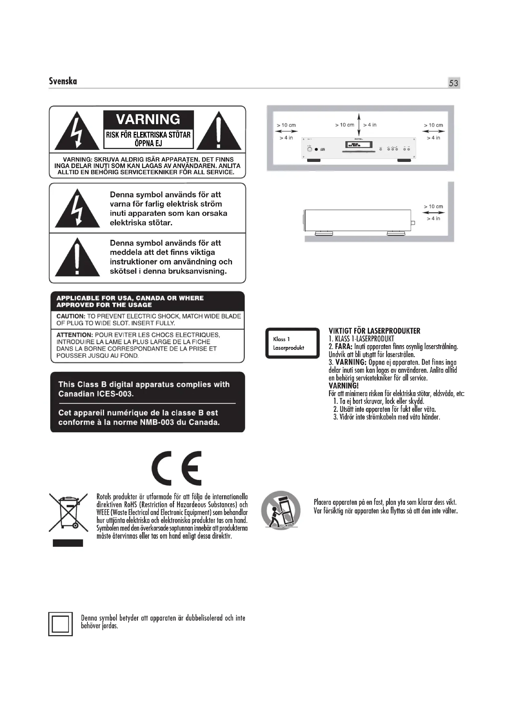 Klass 1Laserprodukt54 RCD-12 CD-spelare VARNING! Försök aldrig att själv utföra service på apparaten. Anlita alltid en behörig servicetekniker för all service. VARNING! För att undvika risk för elektriska stötar och brand, utsätt inte apparaten för vatten eller fukt. Ställ aldrig föremål som kan läcka eller droppa vatten, till exempel blomkrukor, i närheten av apparaten. Se till att inga föremål kommer in i apparaten. Om apparaten utsätts för fukt, väta eller om främmande föremål kommer in i den, dra omedelbart ut nätkabeln ur vägguttaget. Lämna sedan apparaten till en behörig servicetekniker för översyn och eventuell reparation. Läs alla instruktioner innan du ansluter eller använder apparaten. Behåll denna bruksanvisning så att du kan studera dessa säkerhetsföreskrifter. Följ alla varningar och säkerhetsföreskrifter i bruksanvisningen och på själva apparaten. Följ alltid alla användarinstruktioner. Använd bara en torr trasa eller dammsugaren när du rengör apparaten. Använd inte enheten nära vatten. Se till att det alltid finns 10 cm fritt utrymme runt apparaten. Ställ inte apparaten på en säng, soffa, matta eller någon liknande yta som kan blockera ventilationshålen. Om apparaten placeras i en bokhylla eller i ett skåp måste det finnas utrymme för god ventilation. Placera inte apparaten nära element eller andra apparater som utvecklar värme. Varning: Strömkabeln används som huvudströmbrytare och måste finnas åtkomlig. Apparaten måste vara ansluten till ett vägguttag enligt markeringen på apparatens baksida (Europa: 230 V/50 Hz, USA: 120 V/60 Hz). Anslut endast apparaten till vägguttaget med den medföljande strömkabeln eller en exakt motsvarighet. Modifiera inte den medföljande strömkabeln på något sätt. Ändra inte jord eller polaritet. Använd inte någon förlängningskabel. Strömkabeln används som huvudströmbrytare. För att koppla från enheten helt och hållet måste nätkabeln lossas från strömuttaget. Standby-lysdioden lyser inte när strömkabeln inte är inkopplad. Strömkabeln används som huvudströmbrytare och måste vara åtkomlig. Placera inte strömkabeln så att den kan bli utsatt för åverkan, extrem värme eller skadas på annat sätt. Var särskilt noga med att inte skada kabelns ändar. Strömkabeln ska kopplas ur vägguttaget vid åskväder eller om apparaten inte ska användas under en längre tid. Använd bara tillbehör som rekommenderas av Rotel. Placera apparaten på en fast, plan yta som klarar dess vikt. Var försiktig när apparaten ska flyttas så att den inte välter. Sluta omedelbart använda apparaten och låt behörig servicetekniker kontrollera den om: