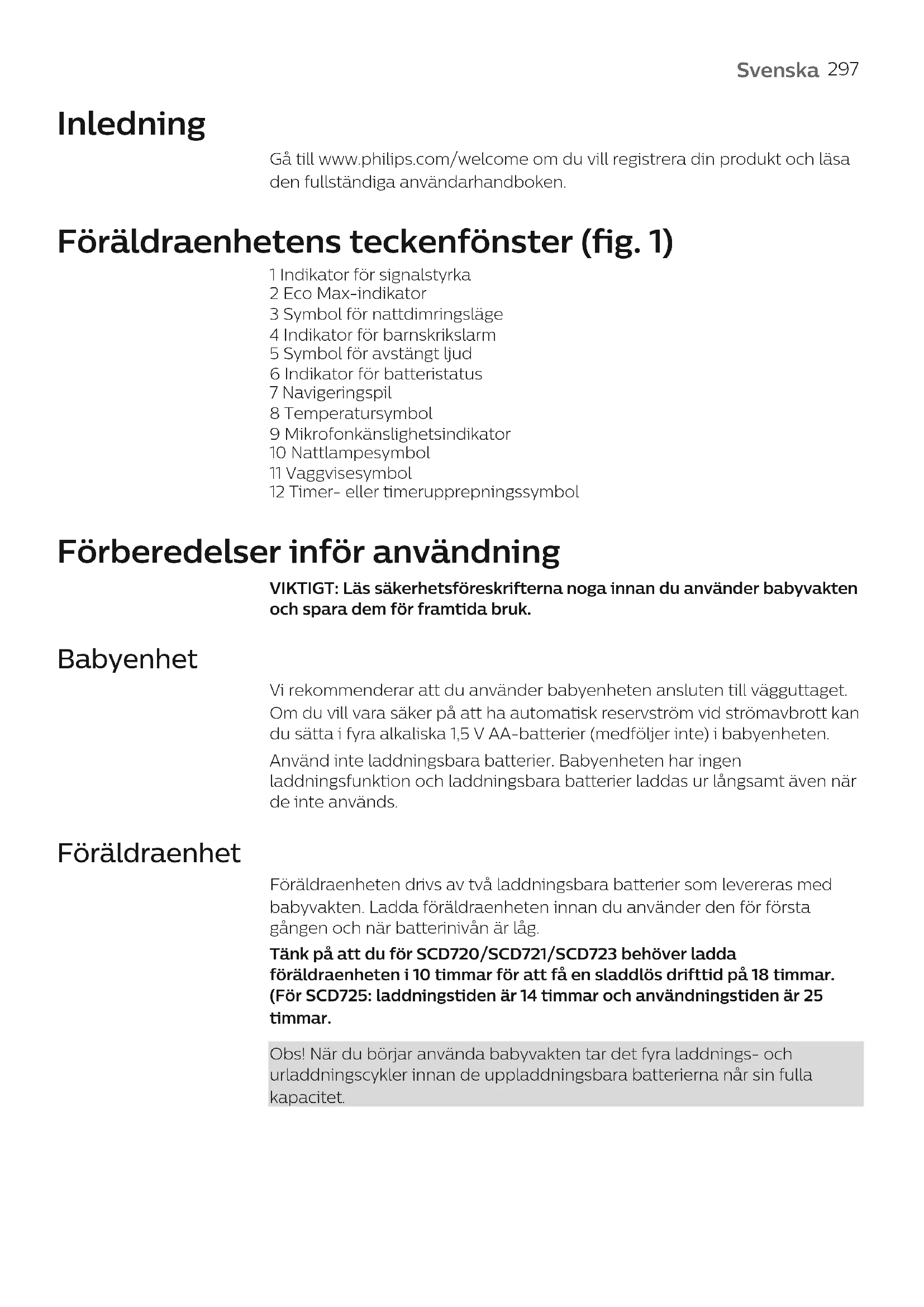 Tänk på att du für SCD720/SCD721/SCD723 behöver laddaforalldraenheten i 10 timmar För att få en sladdlös drifttid på 18 timmar. (För SCD725: laddningstiden ar 14 timmar och användningstiden ar 25 timmar.