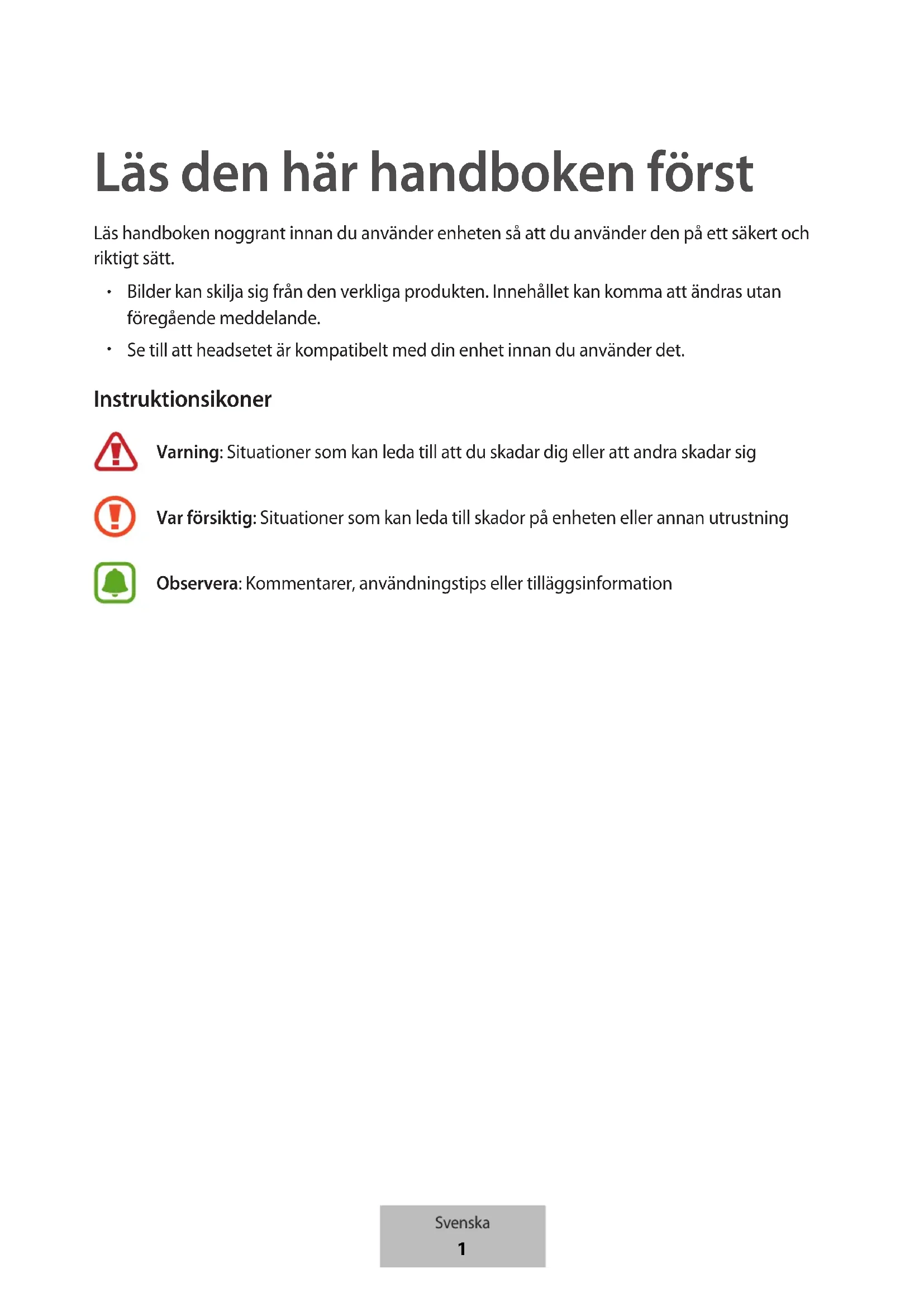 Se till att headsetet är kompatibelt med din enhet innan du använder det. Instruktionsikoner Varning: Situationer som kan leda till att du skadar dig eller att andra skadar sig Var försiktig: Situationer som kan leda till skador på enheten eller annan utrustning Observera: Kommentarer, användningstips eller tilläggsinformation Svenska