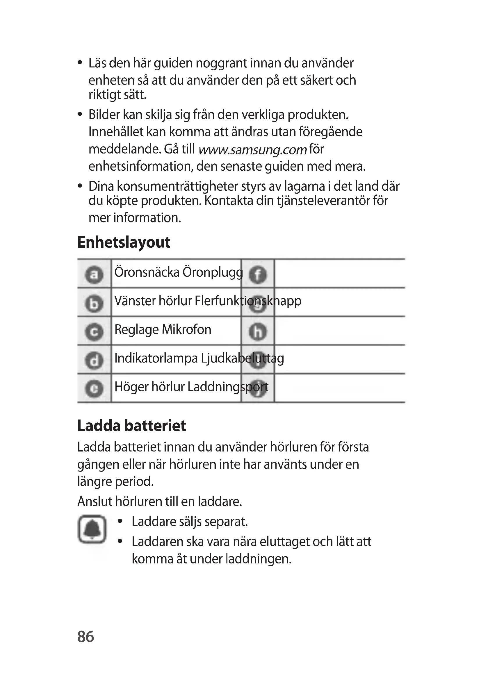 Dina konsumenträttigheter styrs av lagarna i det land där du köpte produkten. Kontakta din tjänsteleverantör för mer information. Enhetslayout Öronsnäcka Öronplugg Vänster hörlur Flerfunktionsknapp Reglage Mikrofon Indikatorlampa Ljudkabeluttag Höger hörlur Laddningsport Ladda batteriet Ladda batteriet innan du använder hörluren för första gången eller när hörluren inte har använts under en längre period. Anslut hörluren till en laddare.