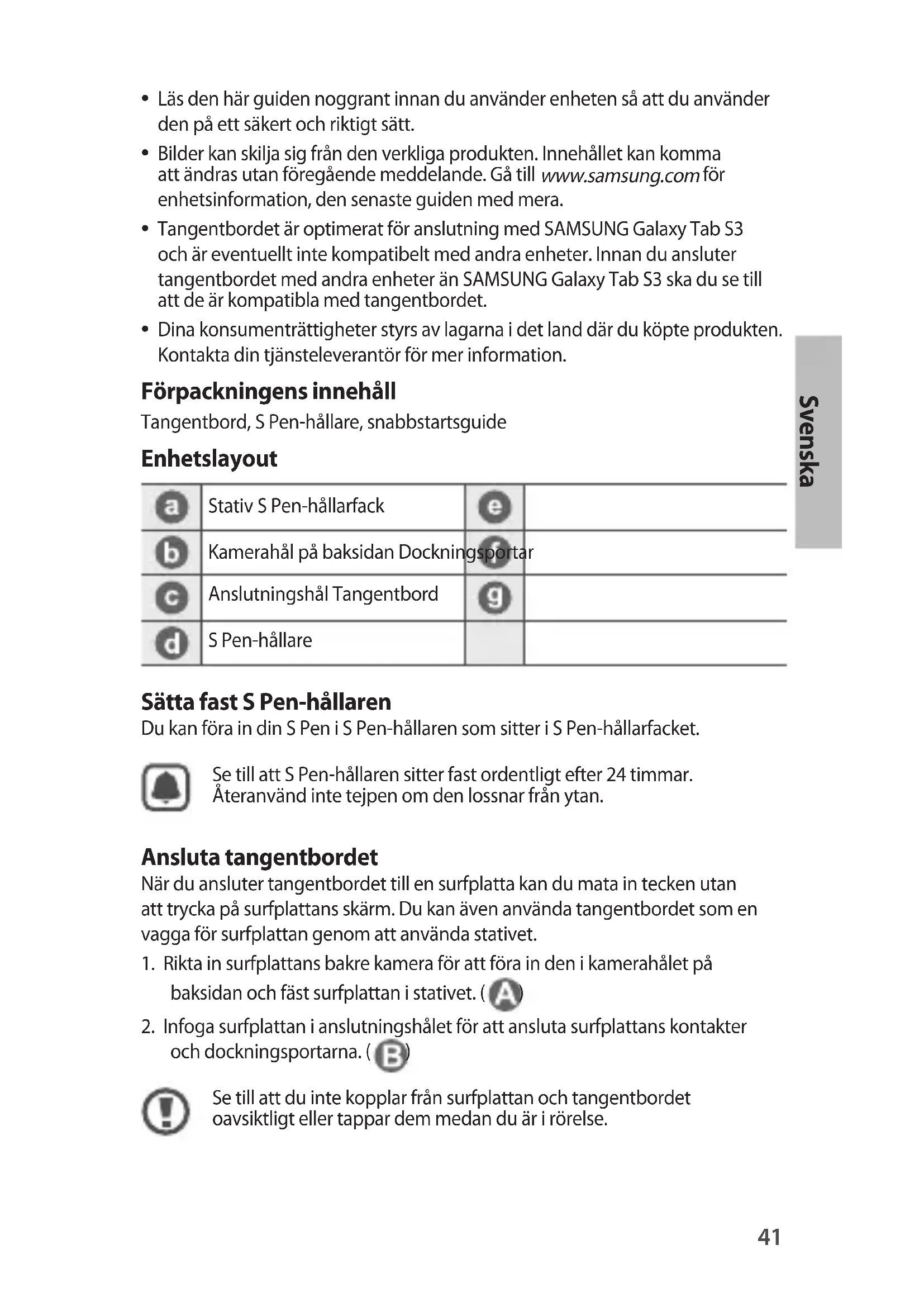 Dina konsumenträttigheter styrs av lagarna i det land där du köpte produkten. Kontakta din tjänsteleverantör för mer information. Förpackningens innehåll Tangentbord, S Pen-hållare, snabbstartsguide Enhetslayout Stativ S Pen-hållarfack Kamerahål på baksidan Dockningsportar Anslutningshål Tangentbord S Pen-hållare Sätta fast S Pen-hållaren Du kan föra in din S Pen i S Pen-hållaren som sitter i S Pen-hållarfacket. Se till att S Pen-hållaren sitter fast ordentligt efter 24 timmar. Återanvänd inte tejpen om den lossnar från ytan. Ansluta tangentbordet När du ansluter tangentbordet till en surfplatta kan du mata in tecken utan att trycka på surfplattans skärm. Du kan även använda tangentbordet som en vagga för surfplattan genom att använda stativet.