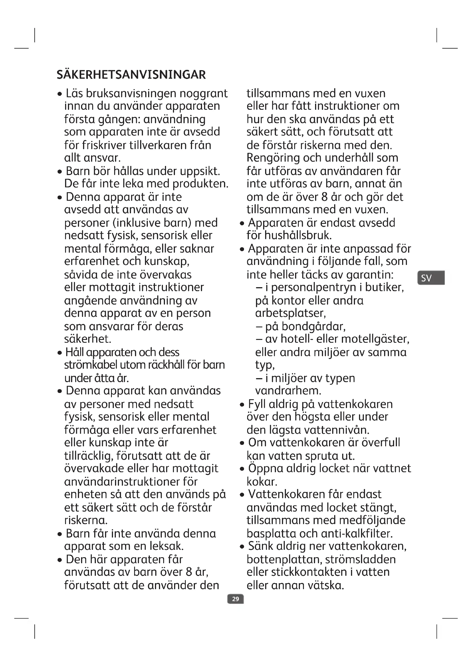 - Sänk aldrig ner vattenkokaren, bottenplattan, strömsladden eller stickkontakten i vatten eller annan vätska. SÄKERHETSANVISNINGAR SV30